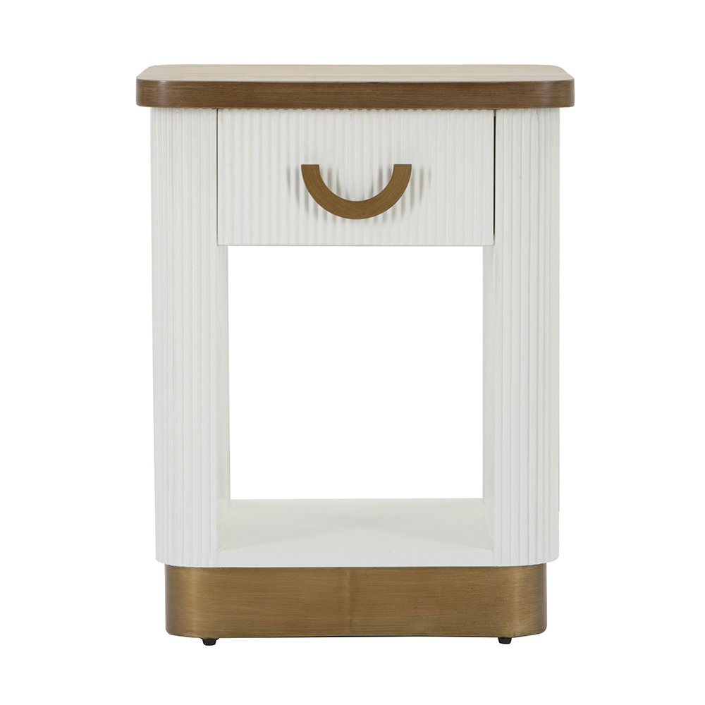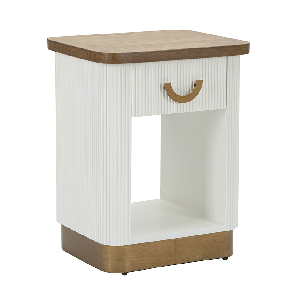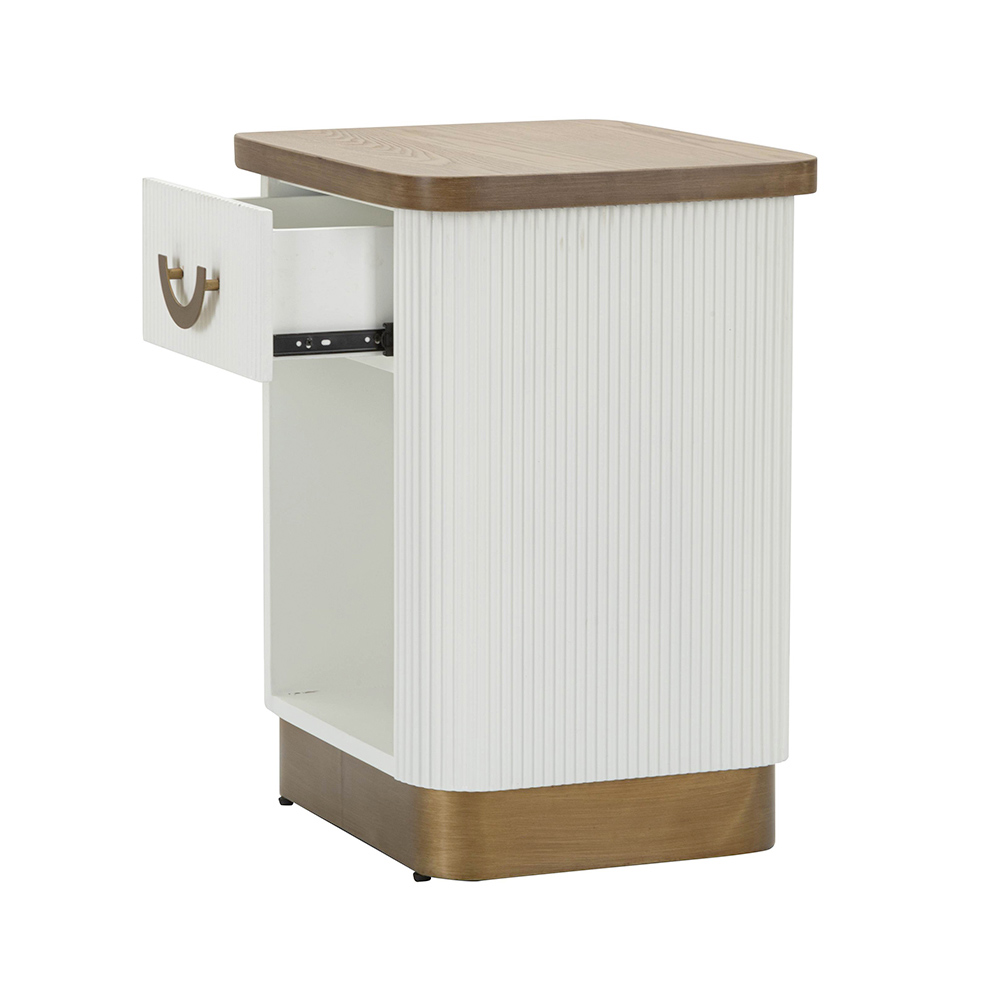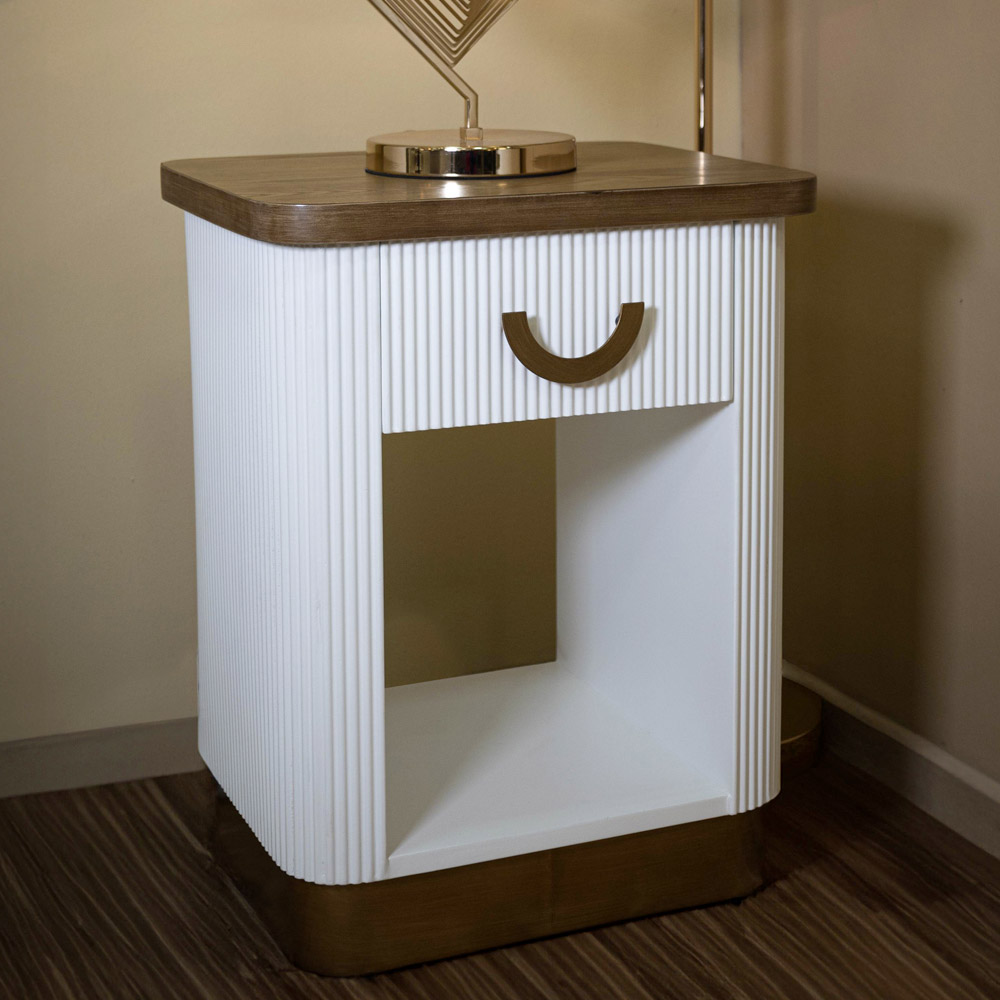 Natbordets riflede hvide base er et udtryk for moderne elegance , med dets rene linjer og lodrette tekstur, der tilføjer dybde og visuel interesse. Detaljen af håndtaget passer perfekt til bunden, hvilket giver et vintage , men moderne look.