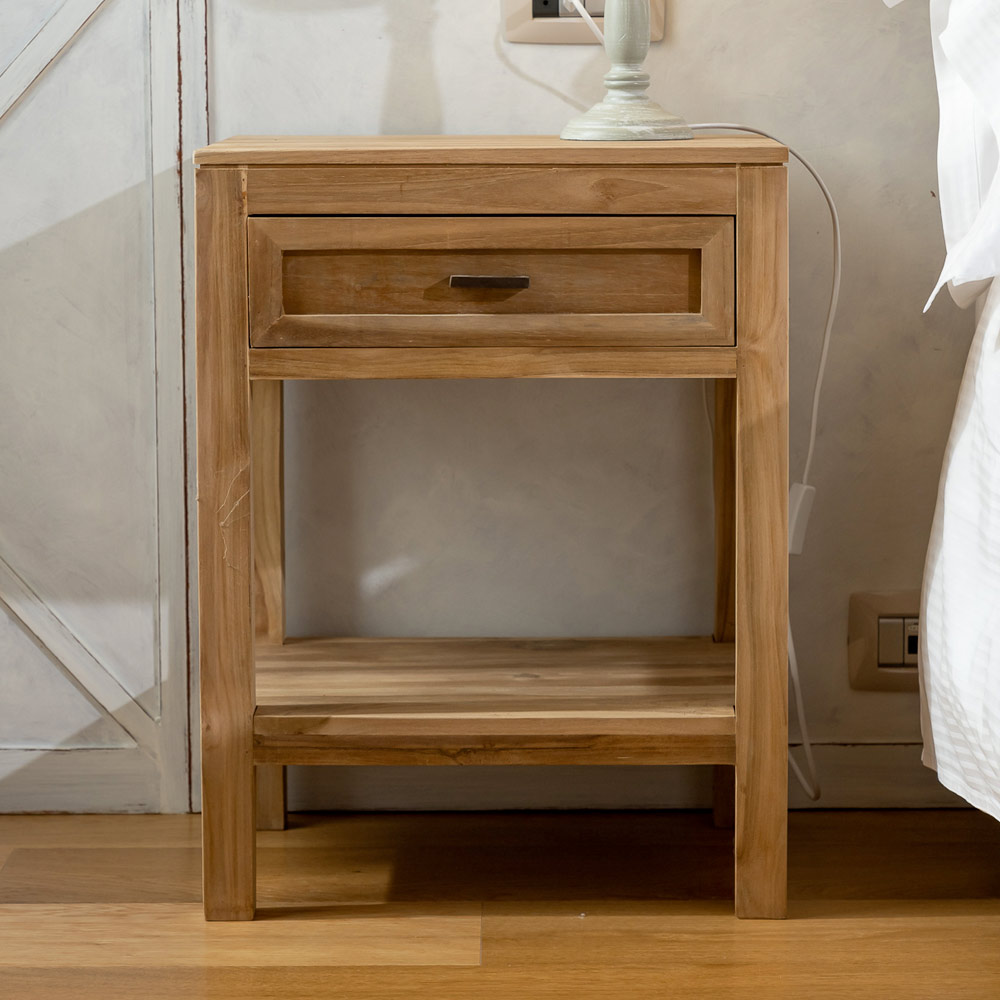 Dette sengebord i massivt teaktræ er et enkelt og funktionelt møbel, ideelt til soveværelset eller som skænk i andre af hjemmets rum. Håndværket og den naturlige træåre giver møblet et varmt og autentisk udseende, perfekt til en tidløs stil.