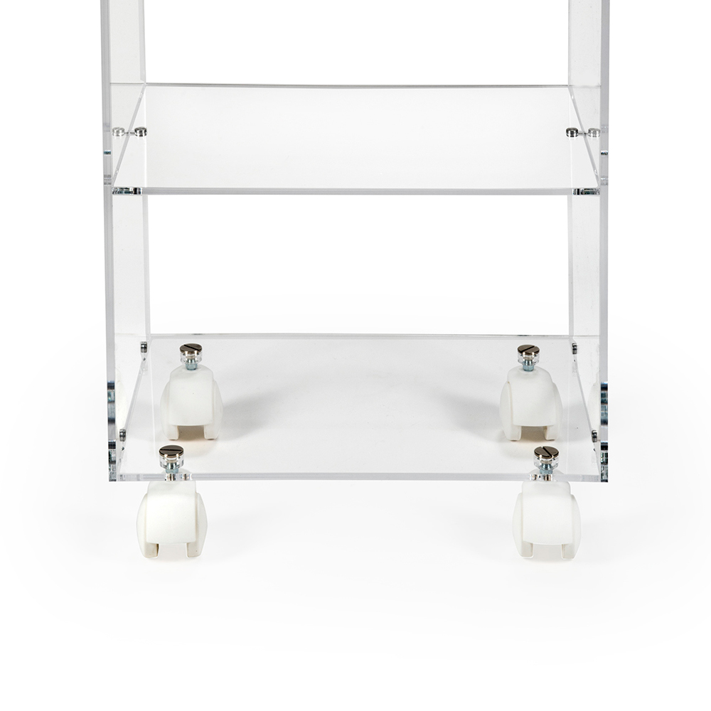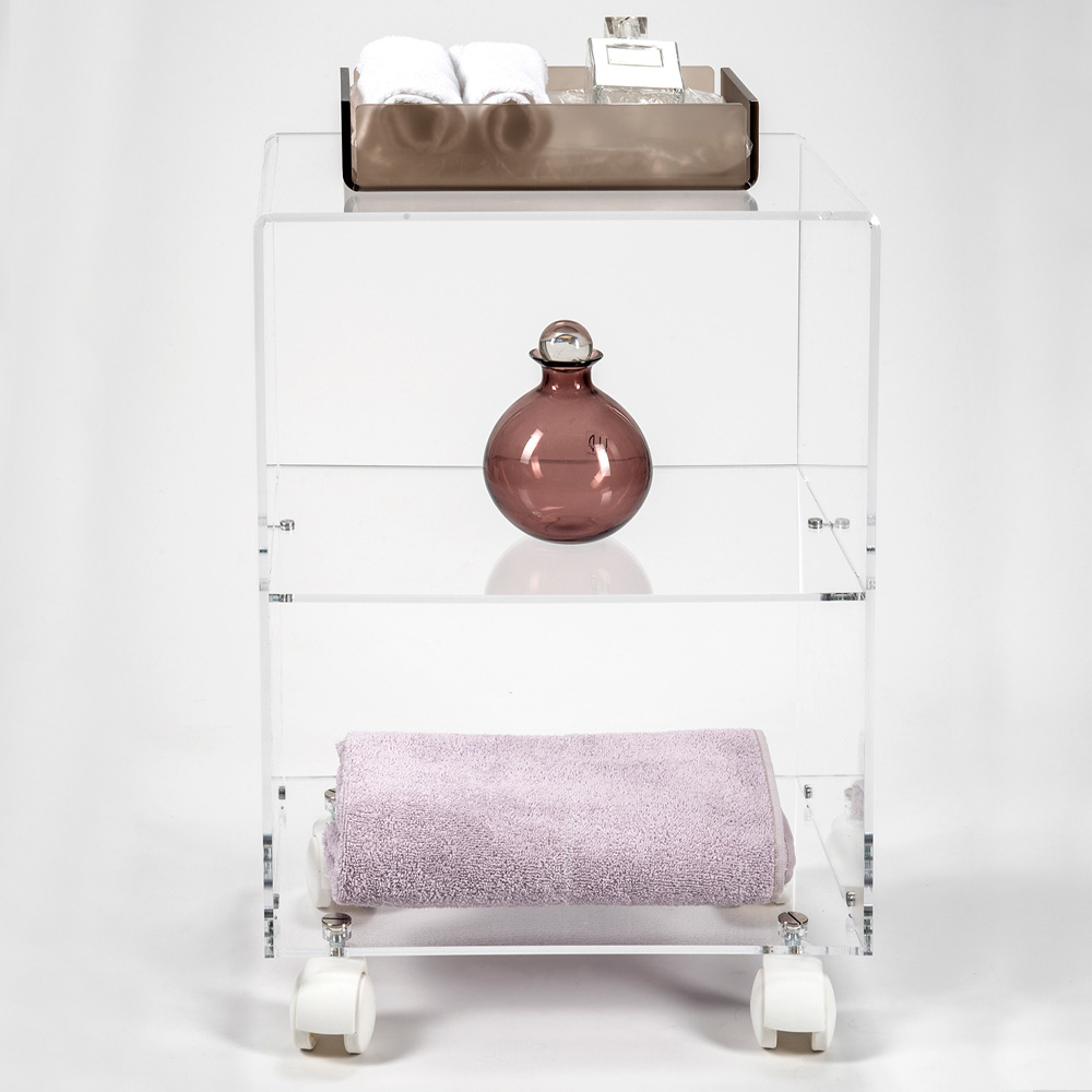 Hver hylde i denne trolley er en scene, der forbedrer, hvad den indeholder, takket være den krystallinske gennemsigtighed af førstevalgs plexiglas. Råmaterialet, 100% virgin polymer plexiglas , sikrer en lysstyrke og glans, der forbliver uændret over tid, en forpligtelse til kvalitet, der kan ses og mærkes.