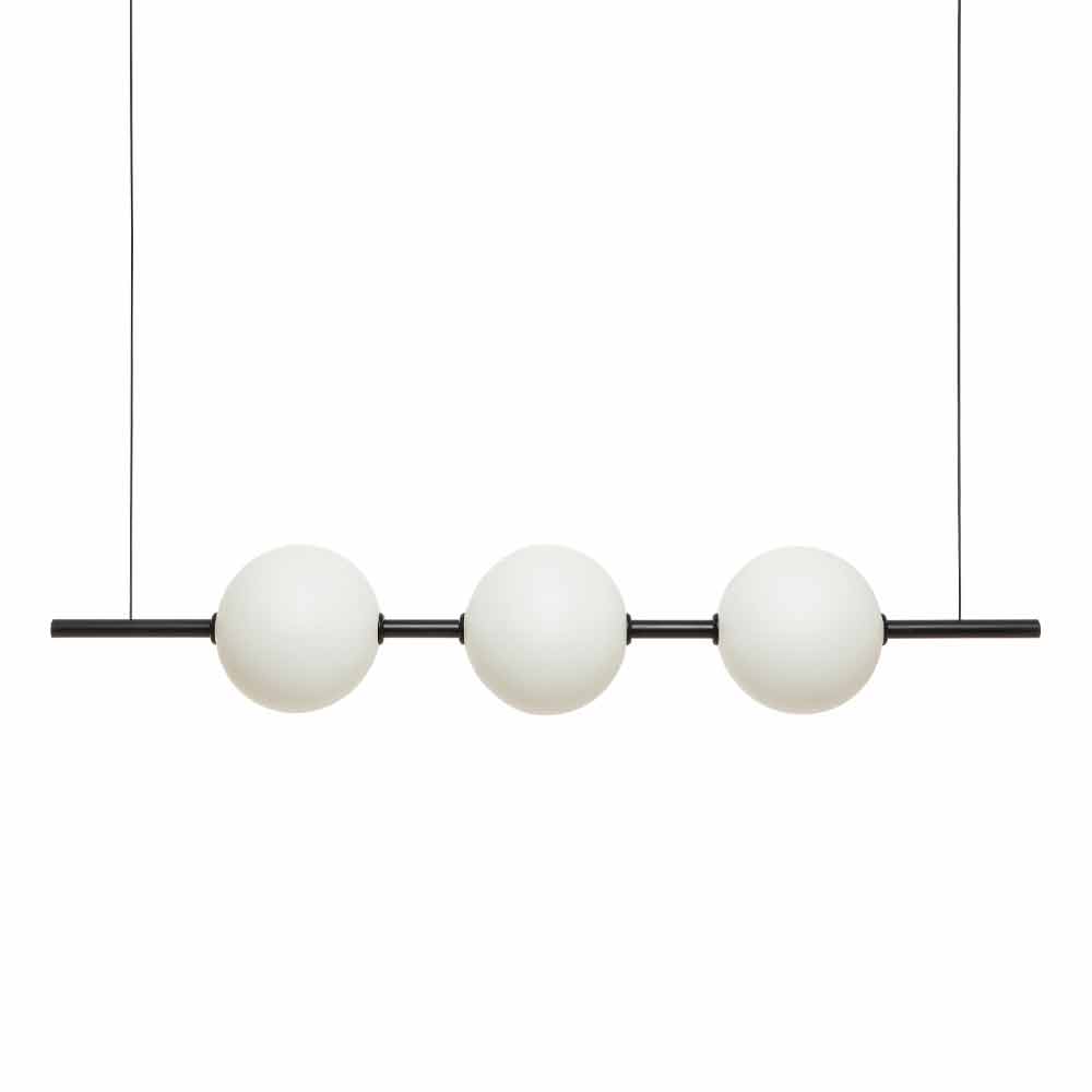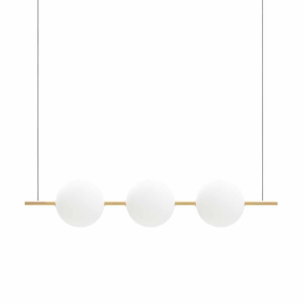 Hængende lampe i sort eller børstet messing med tre kugler af borosilikatglas, fremstillet i Italien.