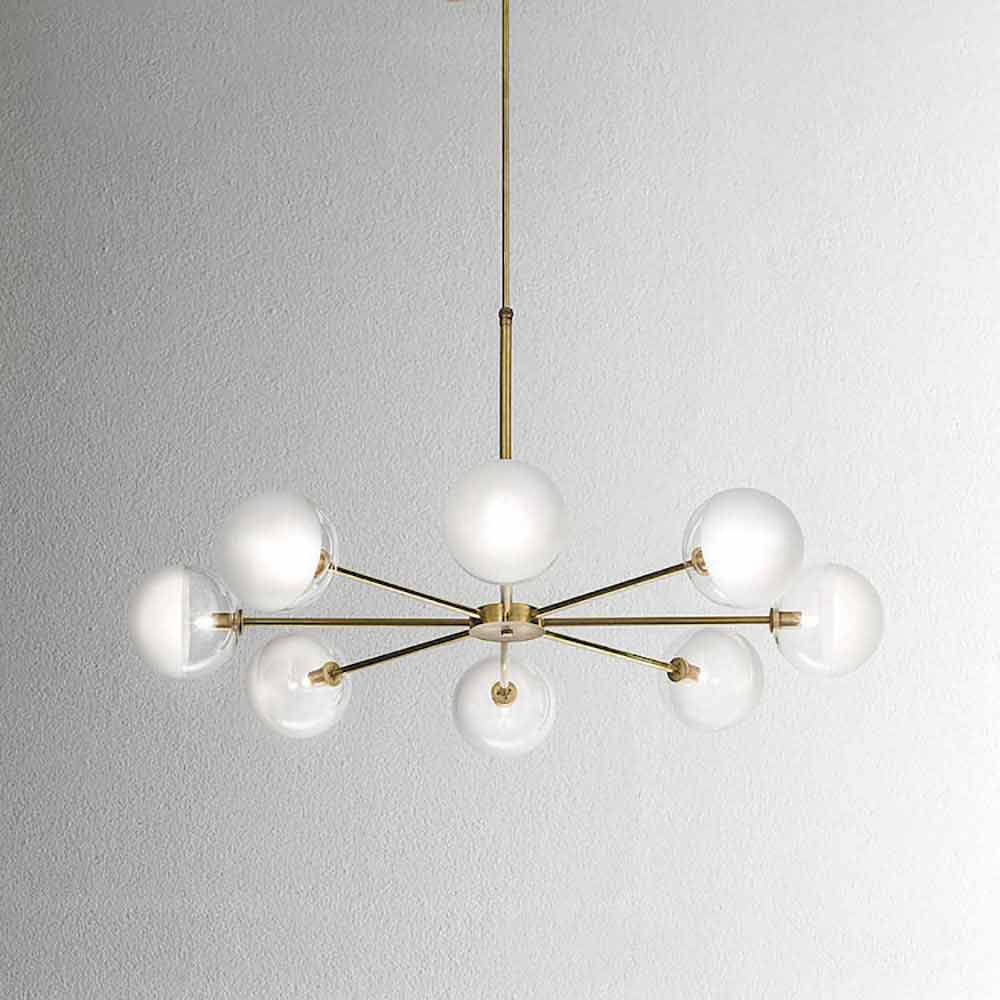 Hængende lampe i naturlig messing og luksuriøst gennemsigtigt og sandblæst glas fremstillet i Italien.