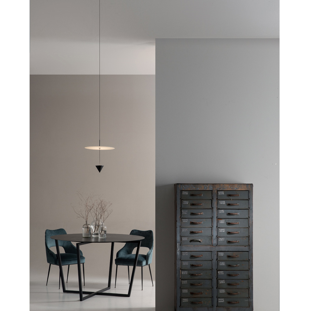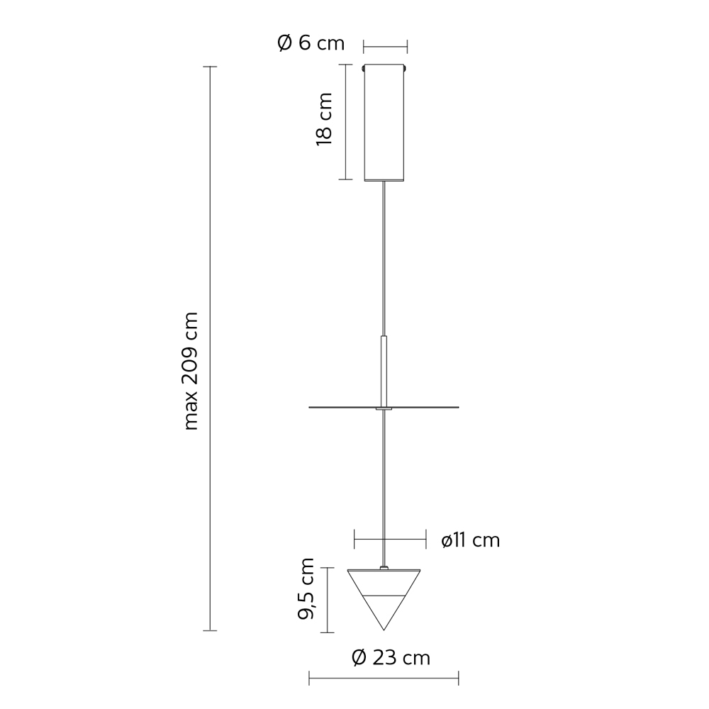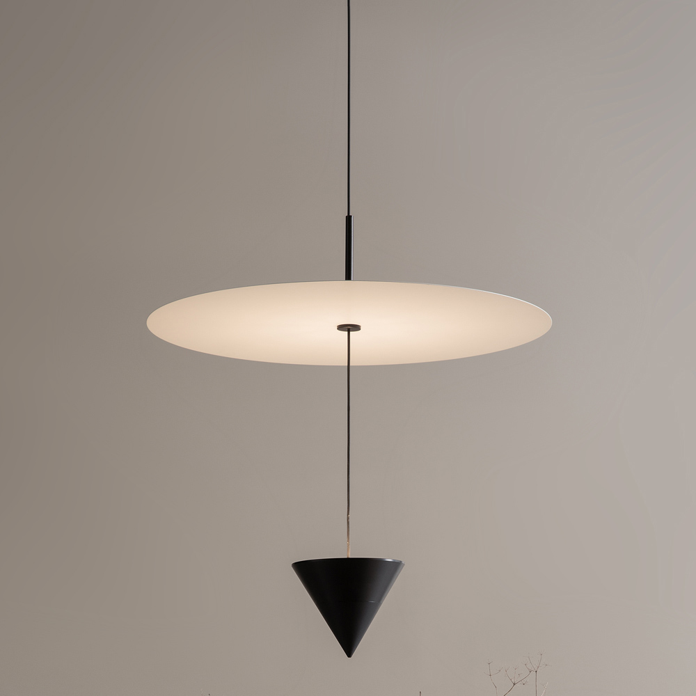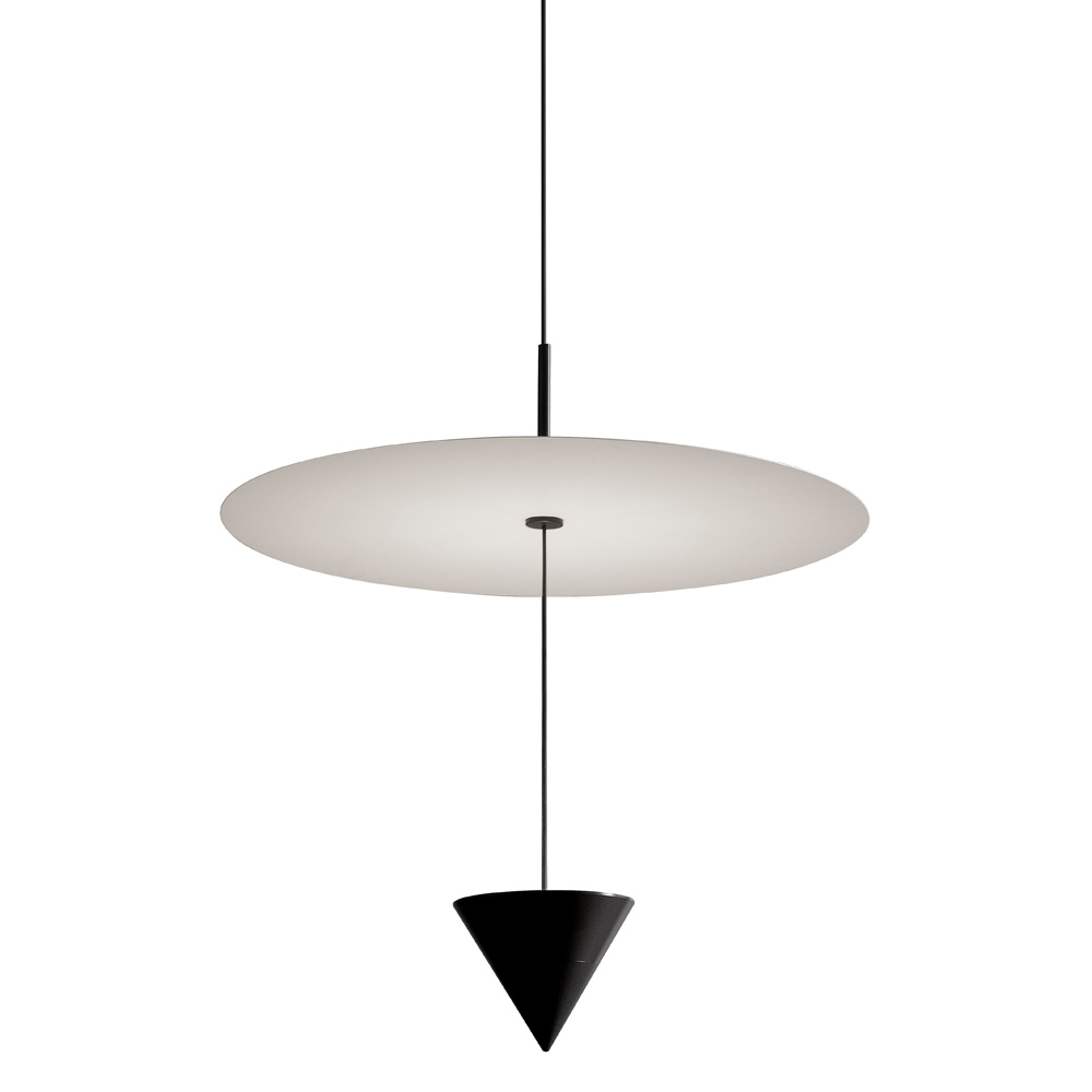 Den består af et cirkulært dekorativt element i hvid aluminium og en sort kegle .