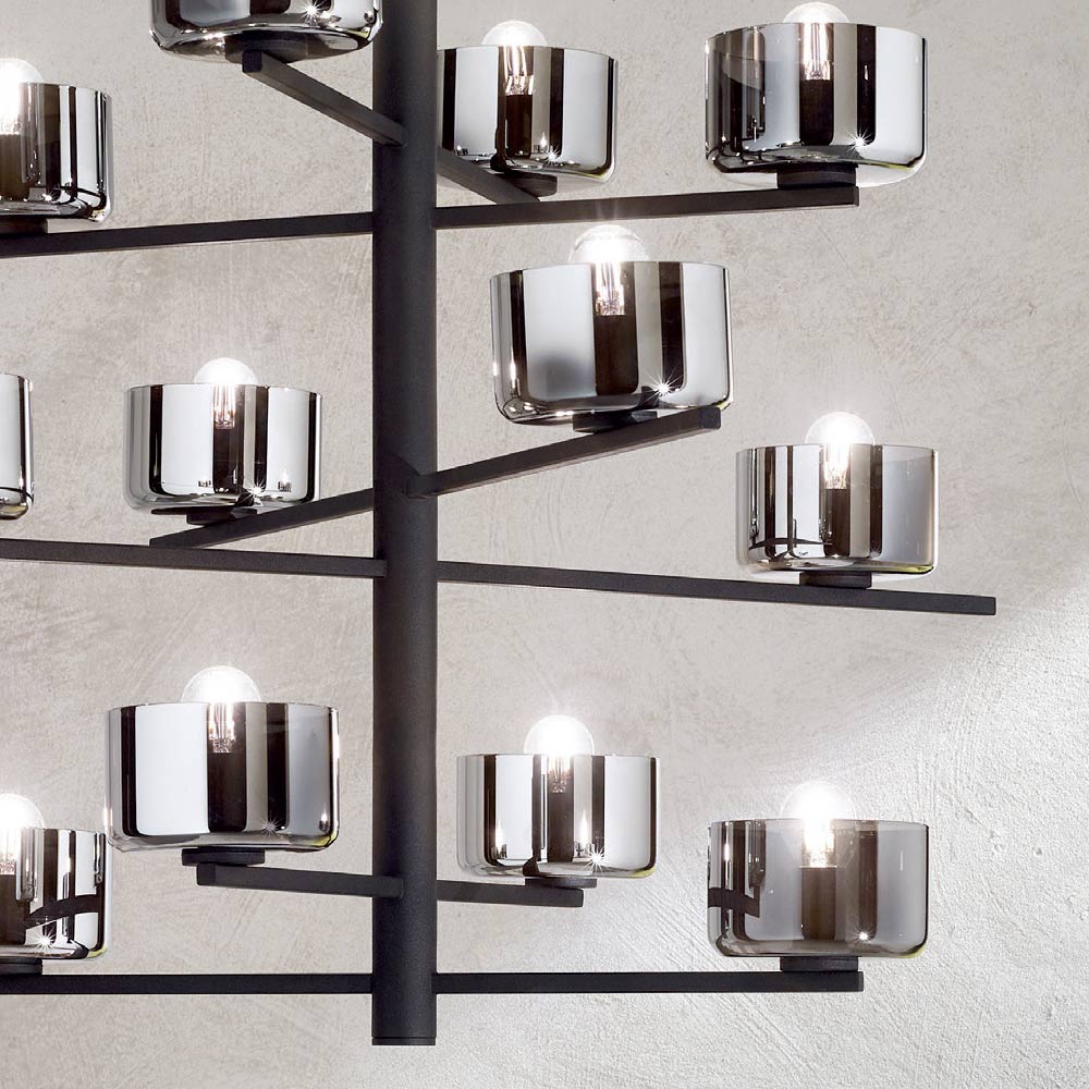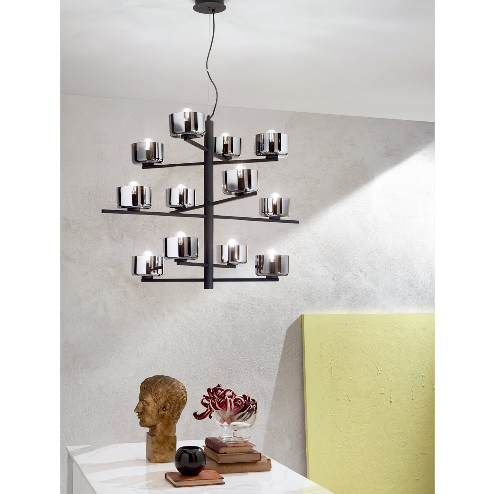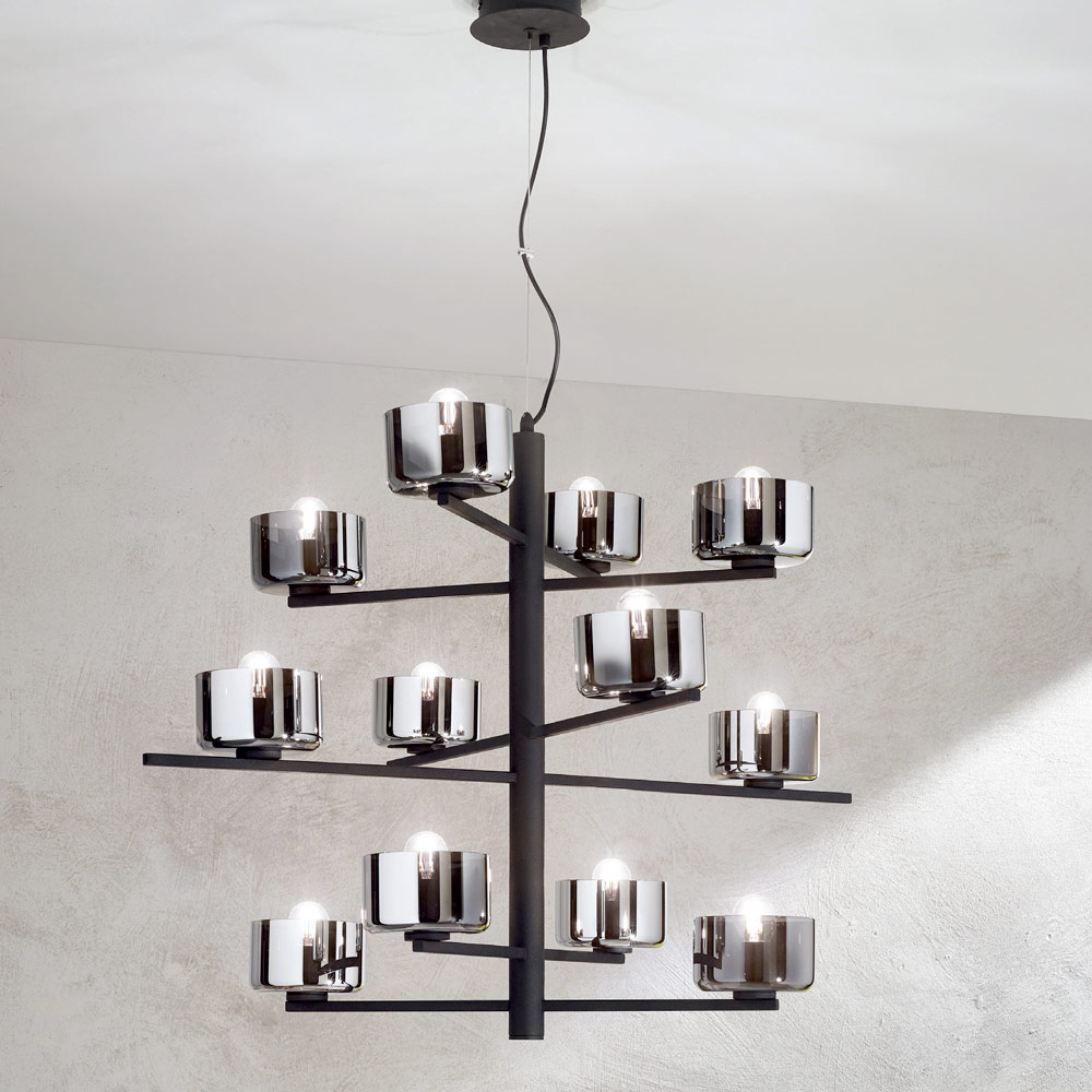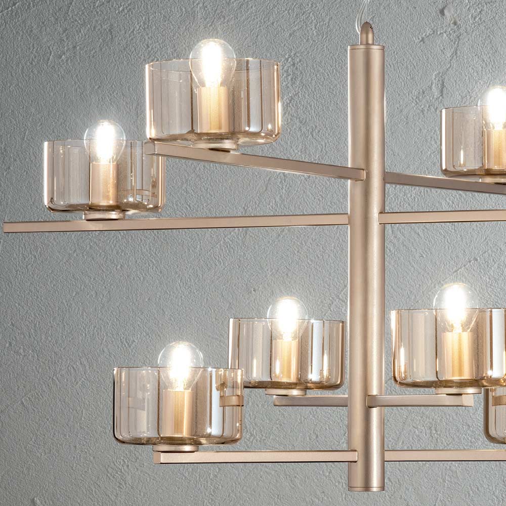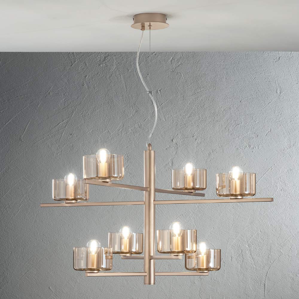 Pendellampe med 8 eller 12 lys i metal og blæst glas.