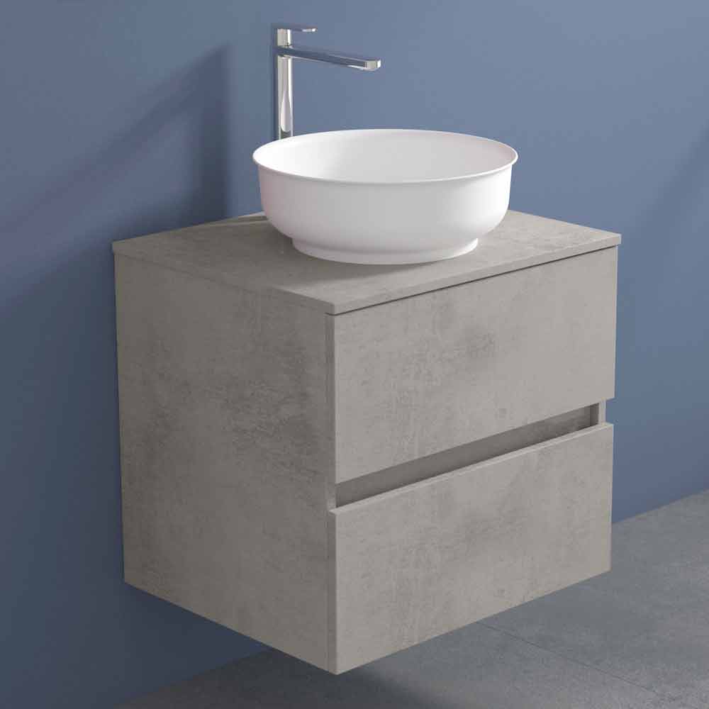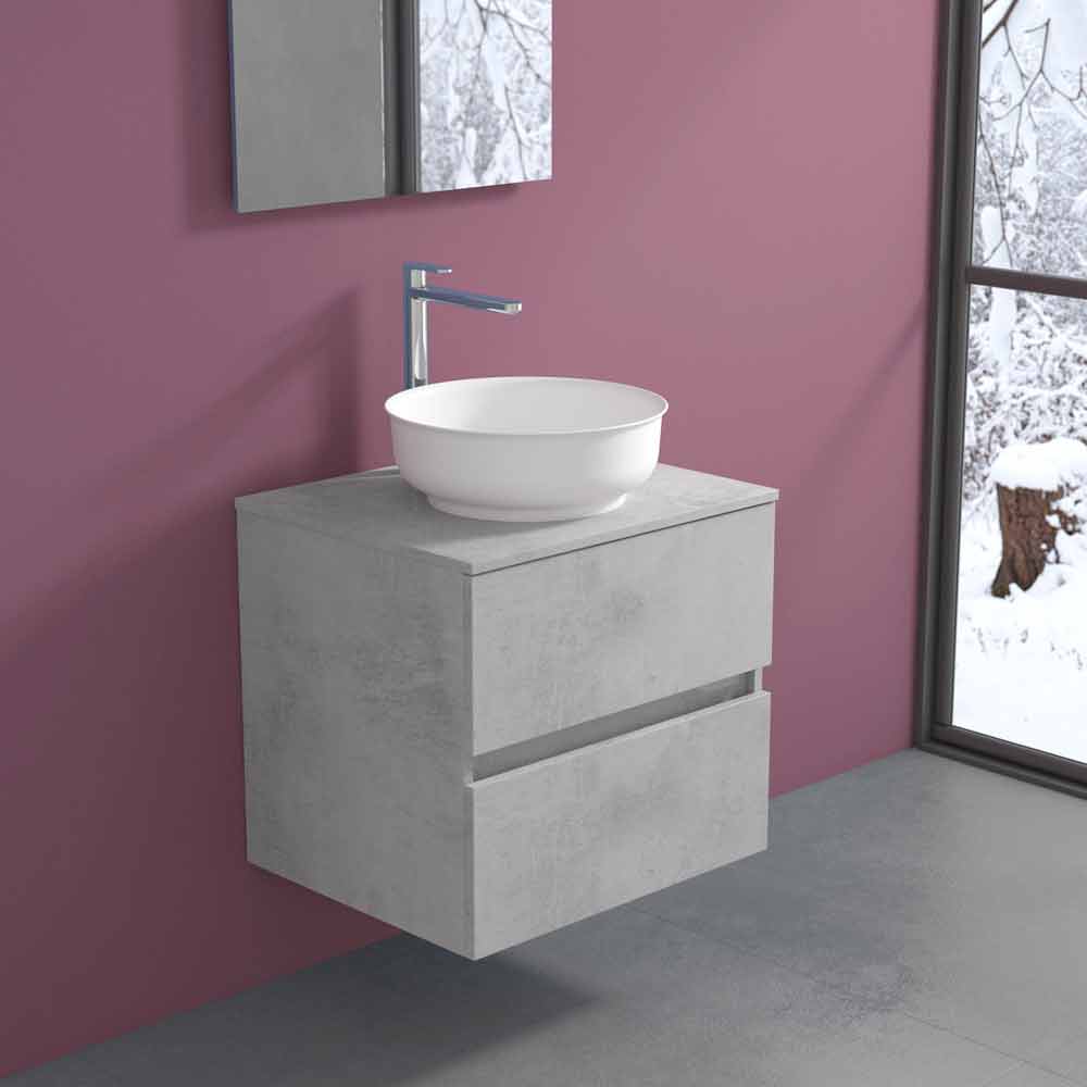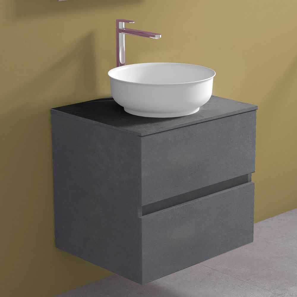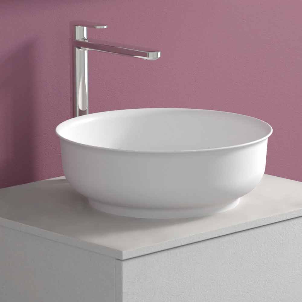 Den runde håndvask til bordpladen er lavet af massiv mat, en uigennemsigtig hvid mineralharpiks , og færdiggjort i uigennemsigtig gelcoat , hvilket gør produktet vandtæt.