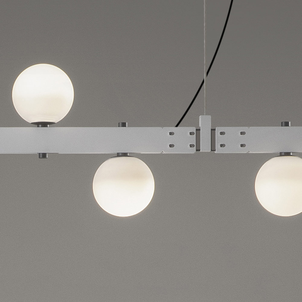 De bærende stænger minder om fortidens tekniske strukturer, og de elektrificerede modulære strukturer understøtter belysningslegemer ( blæste glaskugler og spotlights ), der kan placeres i mængde og frit arrangement, uden brug af elektriske strømkabler, for maksimal udtryksfrihed. .