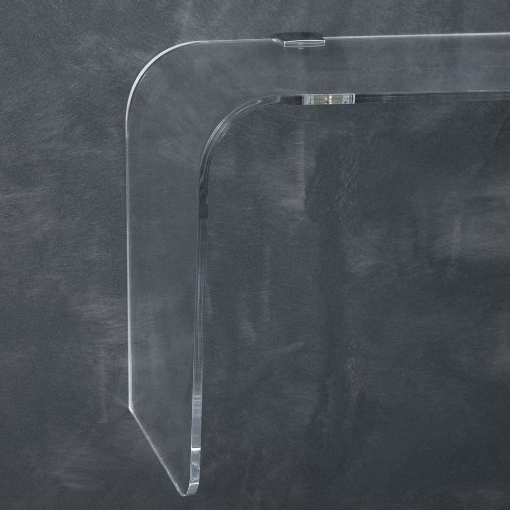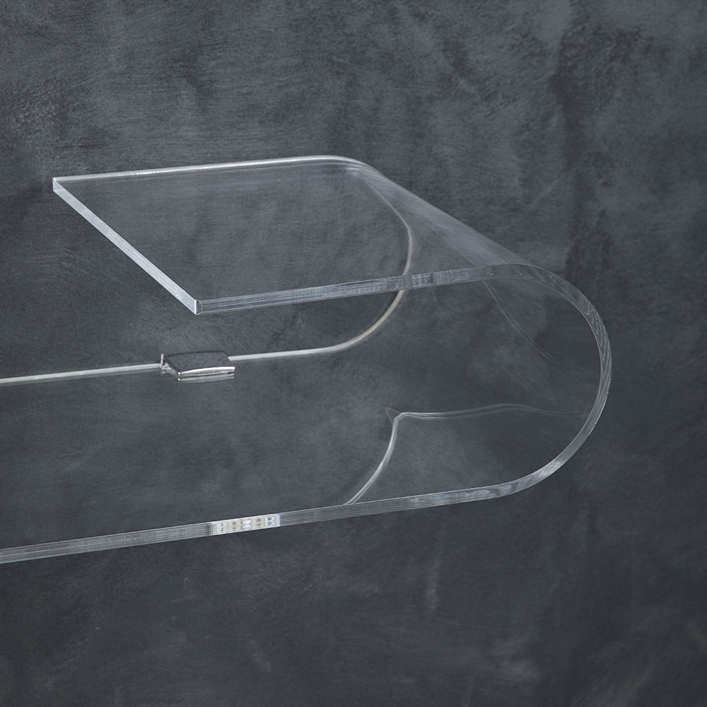 Denne vægkonsol er udelukkende lavet af 10 mm tyk klar akrylkrystal laserskåret og foldet i hånden for et essentielt og elegant design.