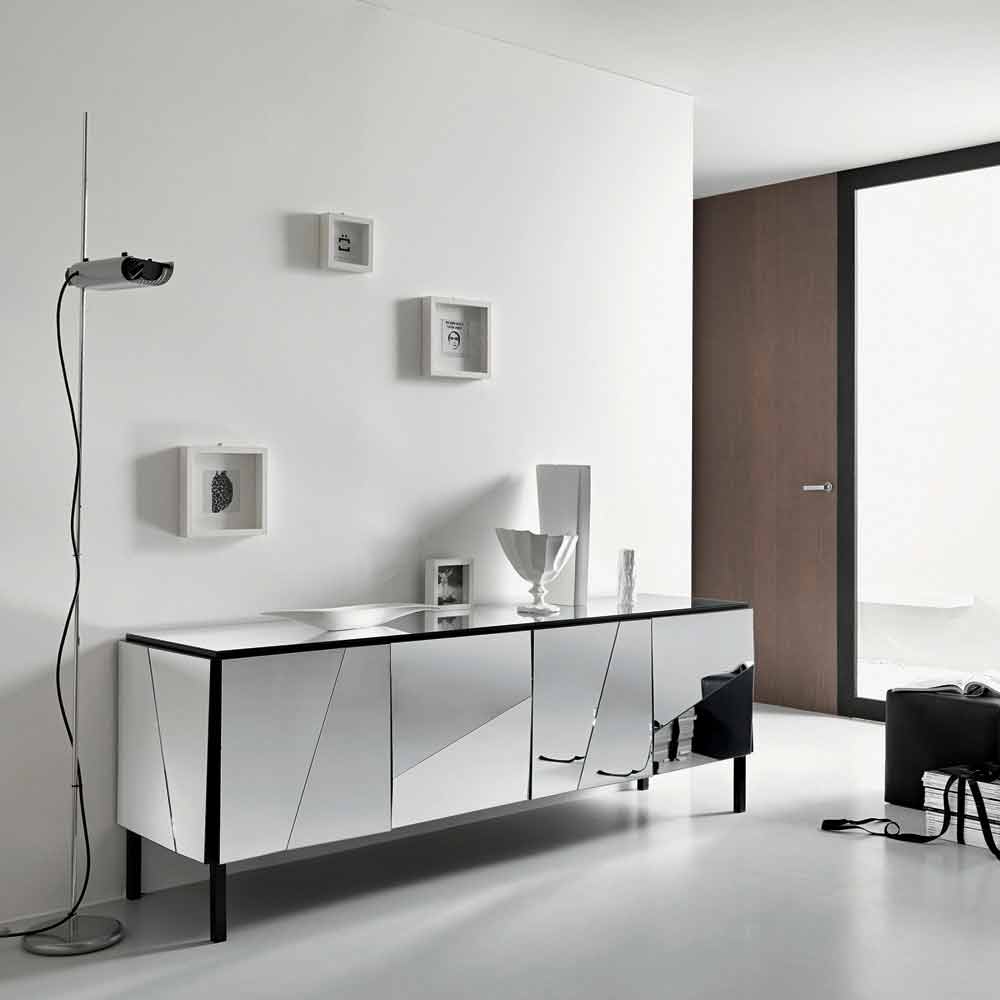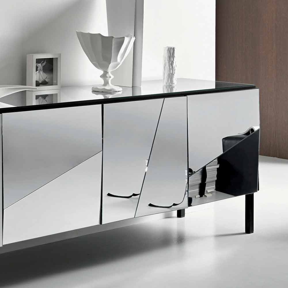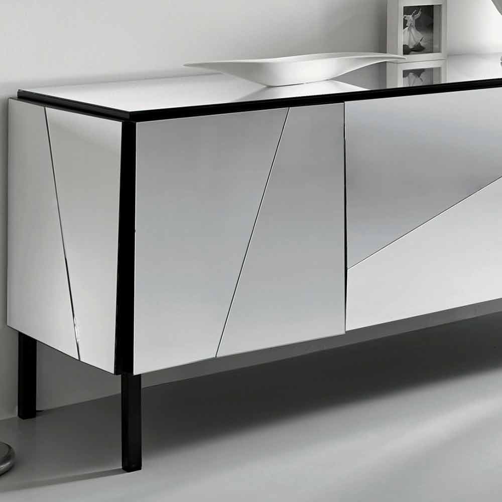 Lavet med en struktur og fødder i mattsortlakeret træ, er spejleffekten total takket være glasbeklædningen med konkave og konvekse spejle, der gør den elegant og sofistikeret og giver et strejf af mestring og gæstfrihed til miljøet.