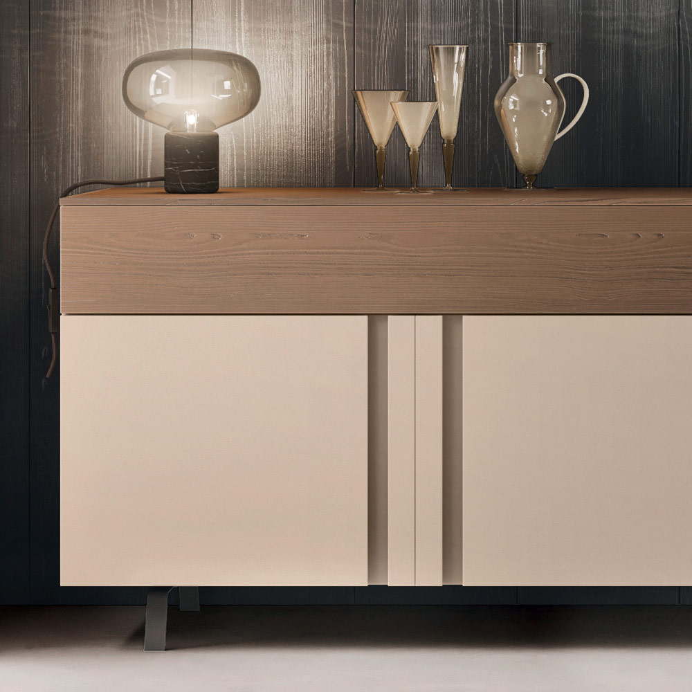Skænk til stue med 4 låger og 2 skuffer i økologisk træ og rillehåndtag, fremstillet i Italien.