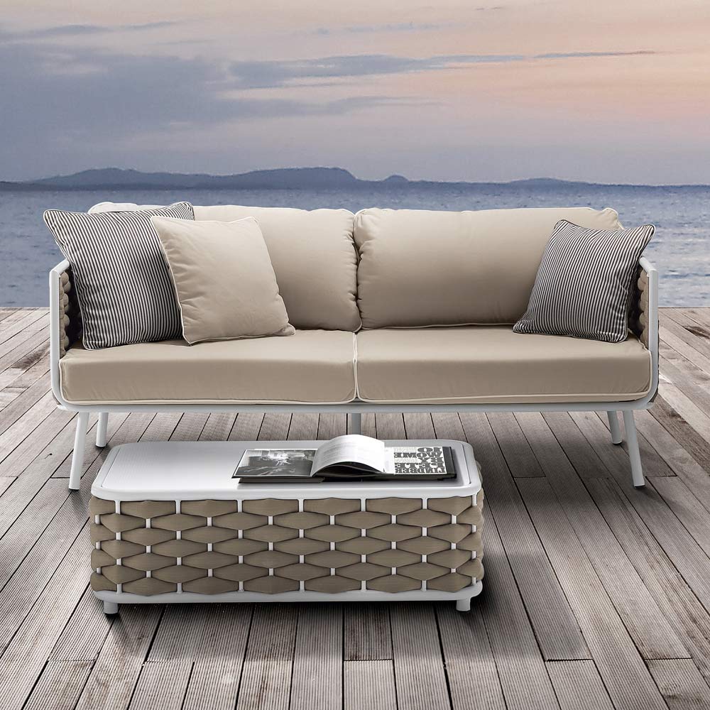 Takket være brugen af særlige materialer af høj kvalitet garanterer denne udendørs sofa udmærket modstandsdygtighed over for vejr, snavs, støv og pletter.