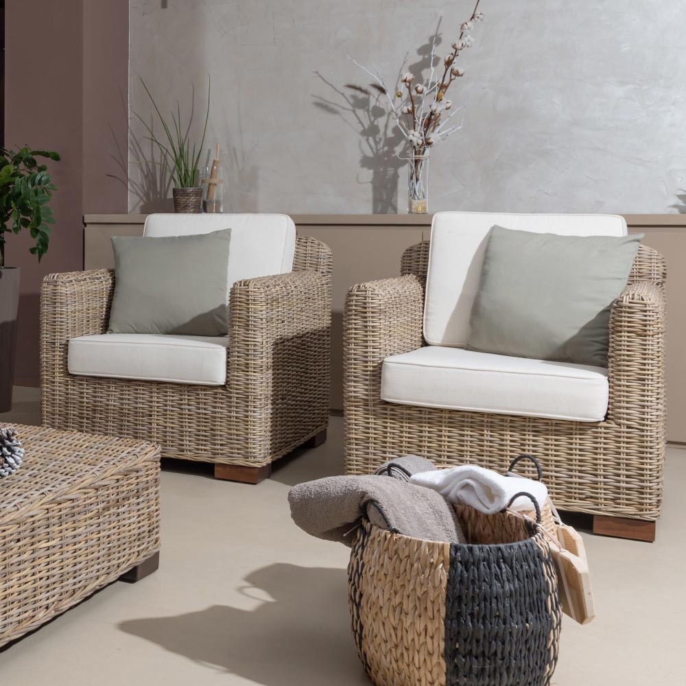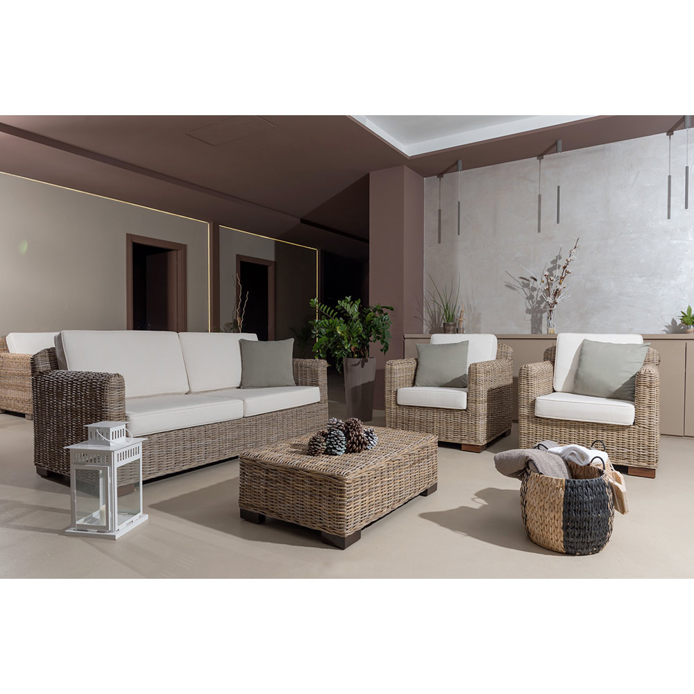 Udendørs loungesæt bestående af 2 lænestole , 3-personers sofa og pufbord i håndvævet grå kubu med standard hynder inkluderet i standard "Ecru" finish .