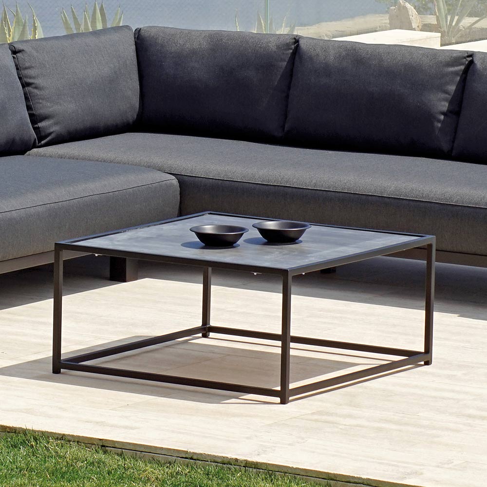 Havestue med 2 sofaer, sort aluminium struktur og keramisk sofabord.