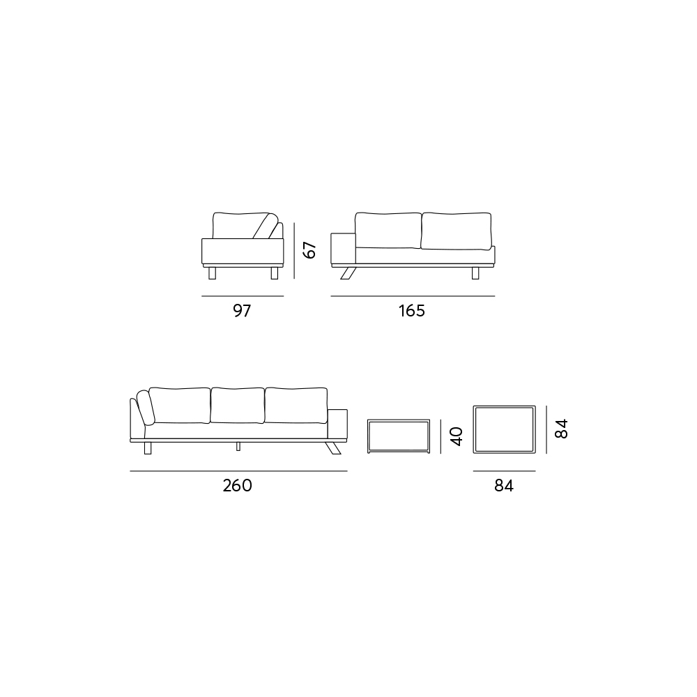 - tre personers sofa: B 260 x D 97 x H 67 cm;