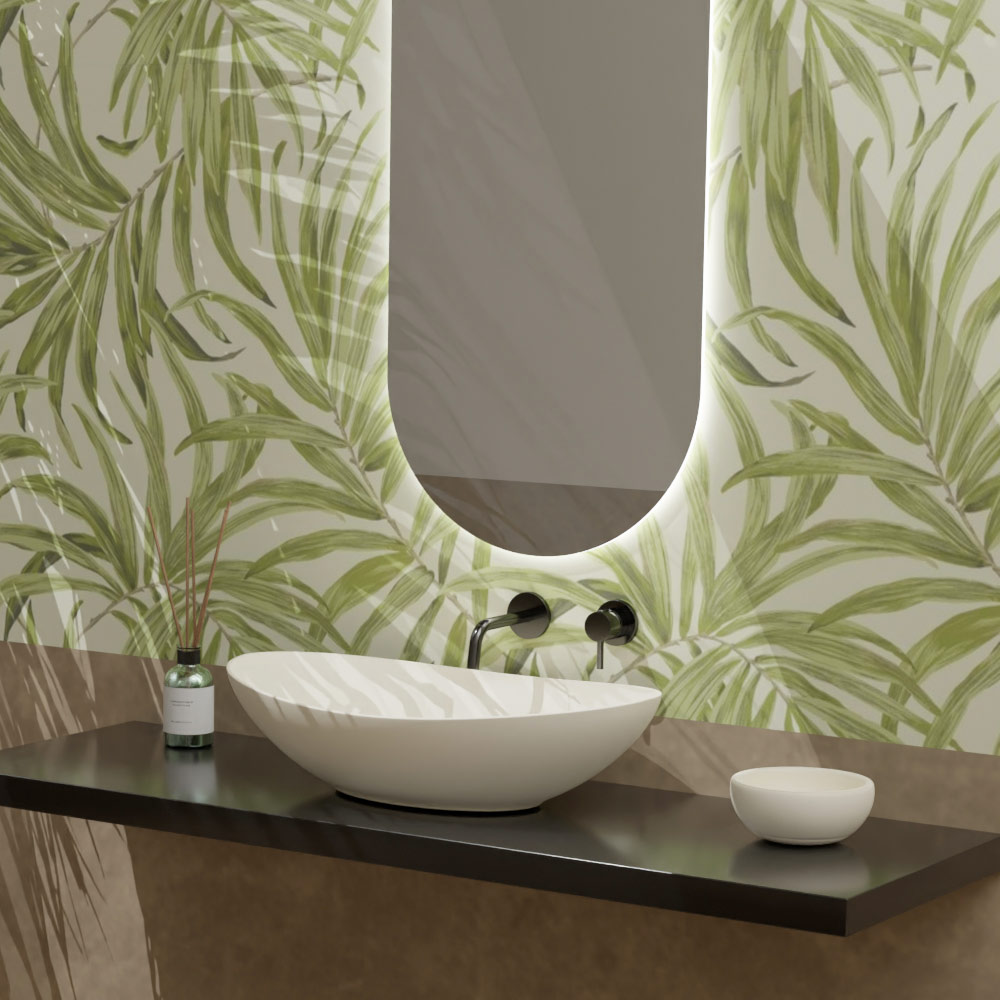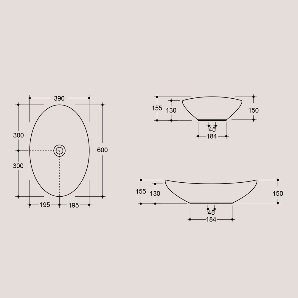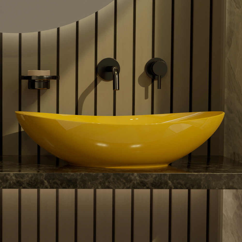 Oval håndvask i bordplade i blank eller mat farvet keramik fremstillet i Italien gennem håndværk . Bølgende og harmoniske linjer giver liv til et moderne og avantgarde-design designet til dem, der elsker en enkel og alsidig stil uden at give afkald på et originalt præg i deres badeværelse.