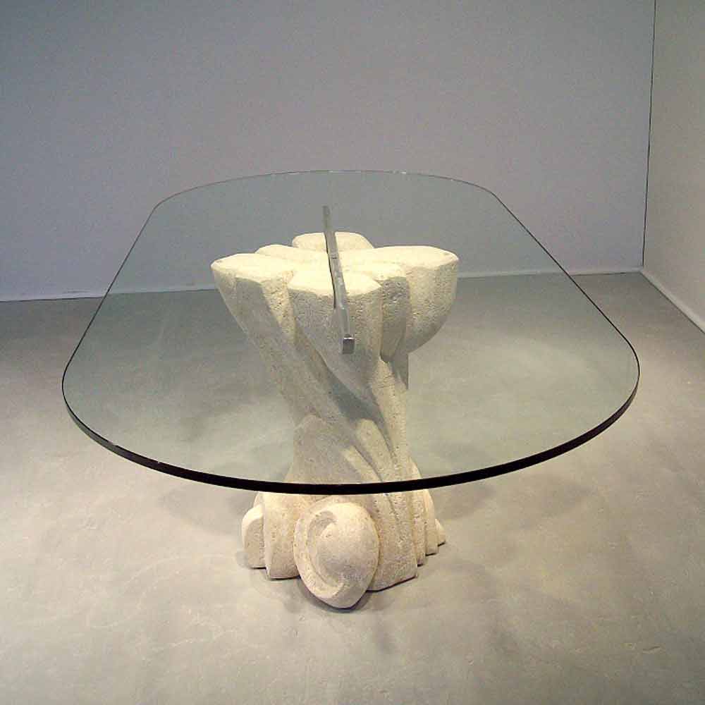 Moderne ovalt spisebord Lavet i Italien med central base i naturlig Vicenza sten , håndskåret af den massive blok og med 15 mm tykt float glasplade, understøttet af en børstet og lakeret råmetalbjælke.