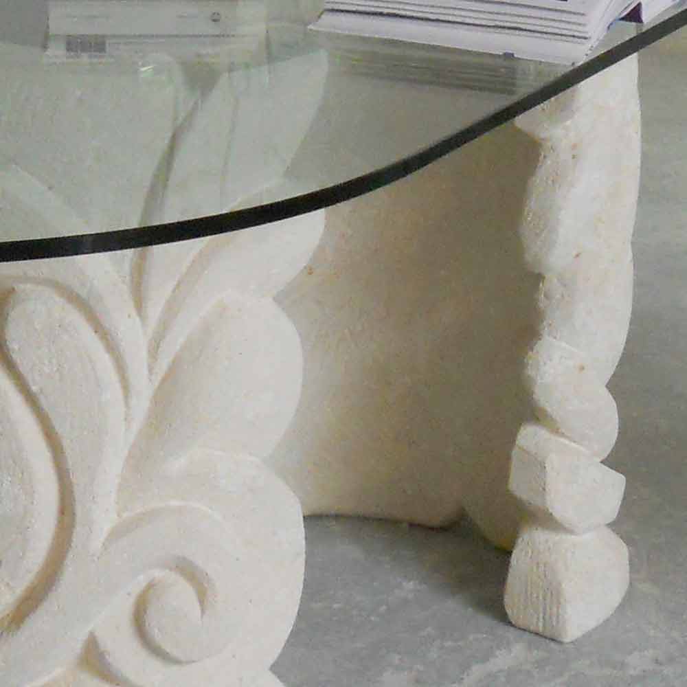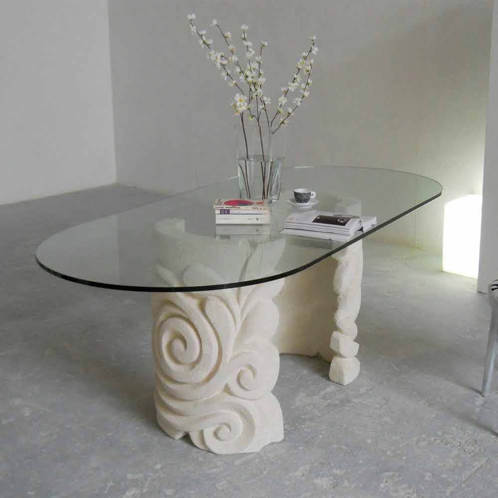 Ovalt spisebord i moderne stil Made in Italy med dobbelt base i natursten Vicenza, manuelt skåret fra fast blok og med floatglas top tykkelse på 15 mm, der hviler på baserne.