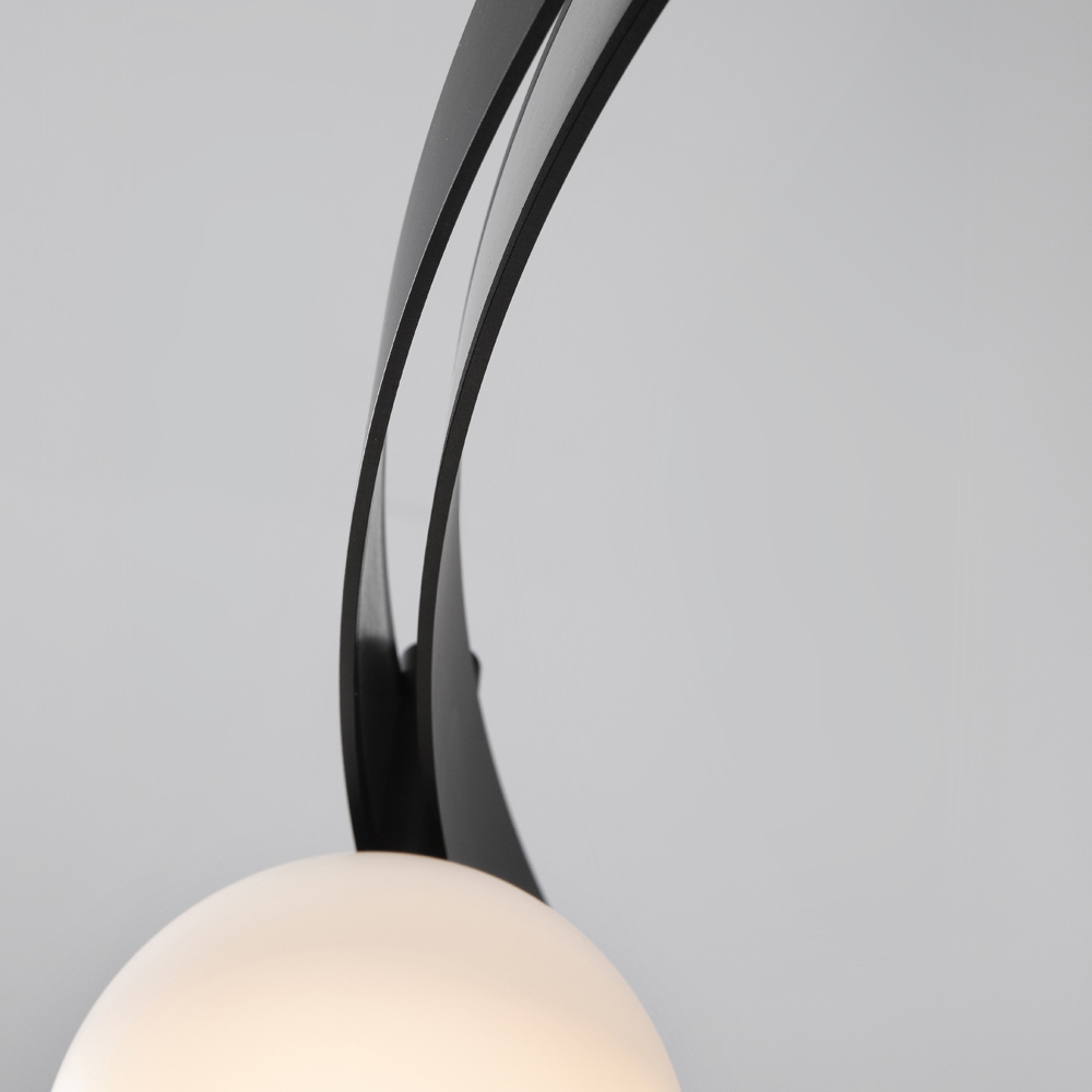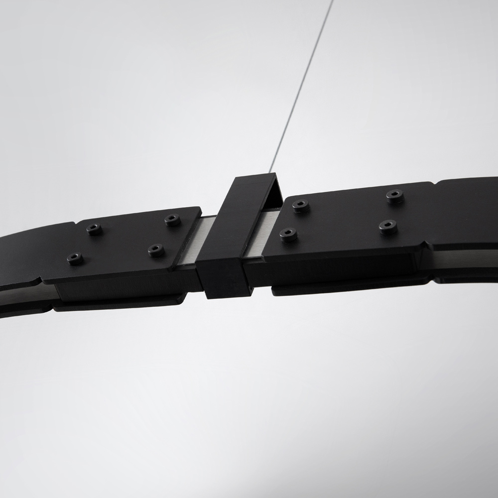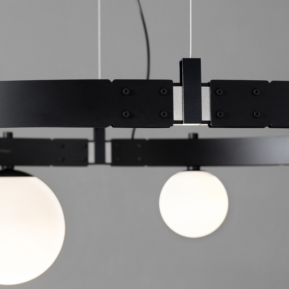 Den ovale lejestang minder om fortidens tekniske strukturer, og de elektrificerede modulære strukturer understøtter belysningslegemer ( blæste glaskugler i to forskellige størrelser), der kan placeres i mængde og frit arrangement uden brug af elektriske strømkabler for maksimal frihed udtryk.
