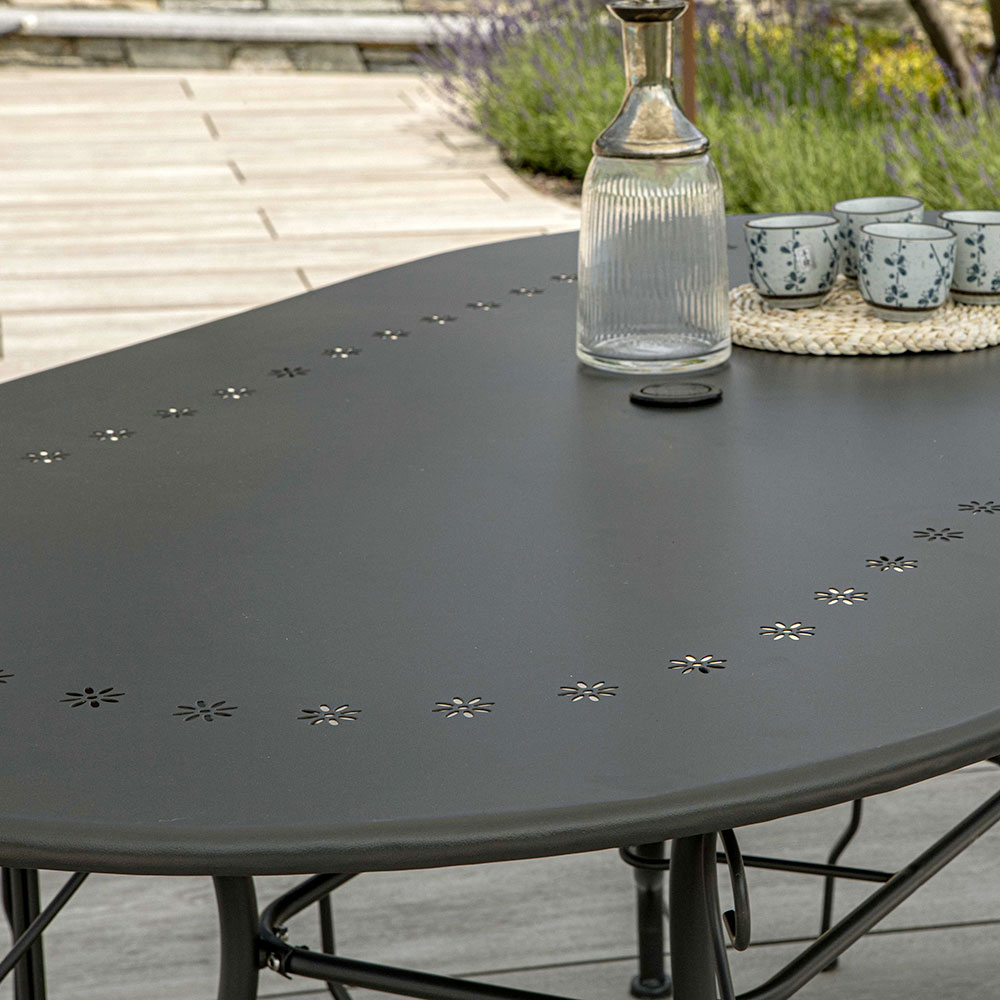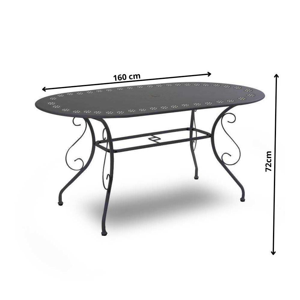 Dette ovale metalbord er et perfekt valg for dem, der gerne vil kombinere det praktiske med stilen. Med sit robuste stel og elegante, buede ben er det et ideelt mødested for hyggelige stunder udendørs.