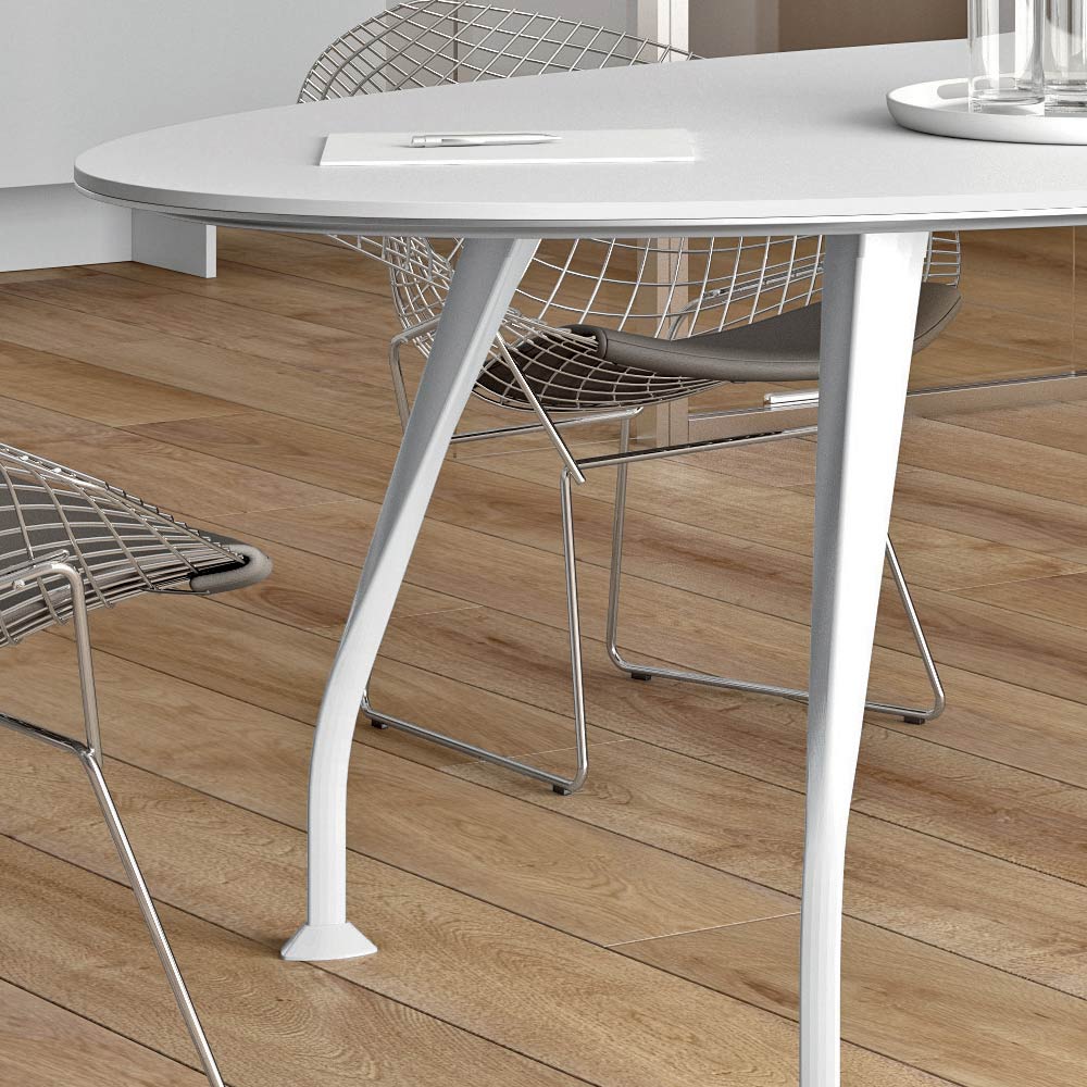 Dette bord består af en oval melaminplade i den hvide finish og 4 Infinity ben, ligeledes i den mat hvide finish.