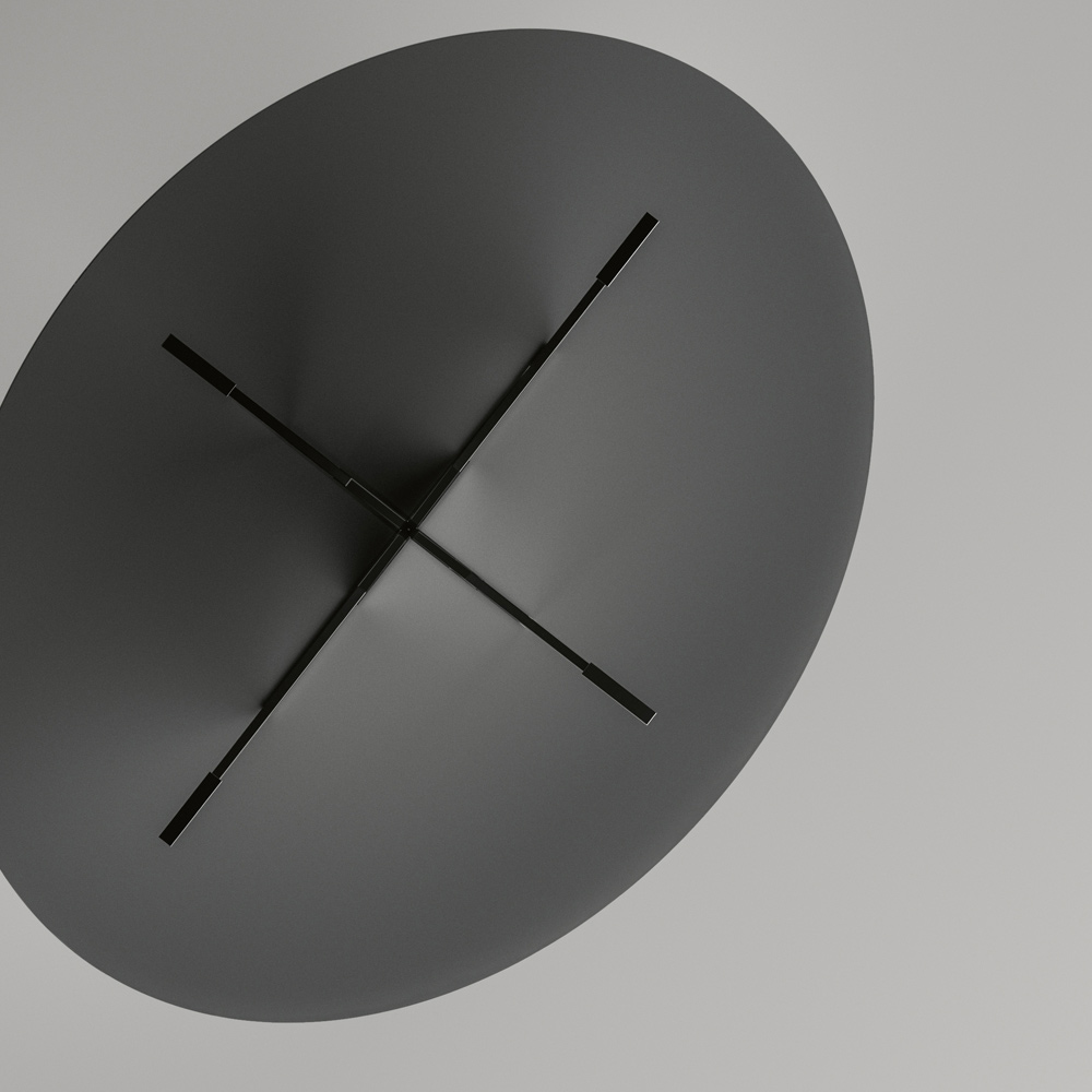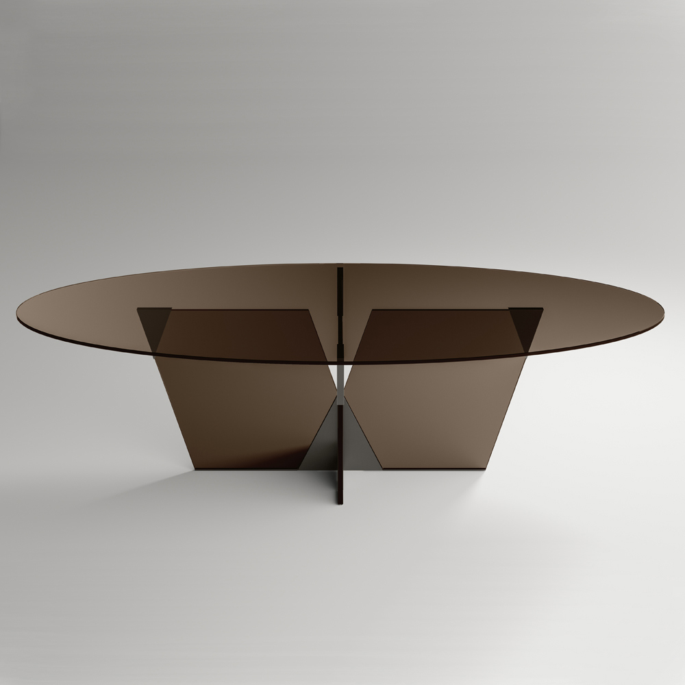 Spisebord lavet i Italien med oval plade og glasbund. Det stærke ved dens æstetik er den arkitektoniske base, der er karakteriseret ved en pyramideformet samling af metal, som udgør den væsentlige del af produktet. Metalelementerne fuldender designet af bordet, der giver form til glasset i basen og beriger det med personlighed og originalitet.