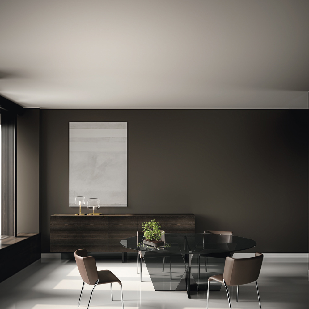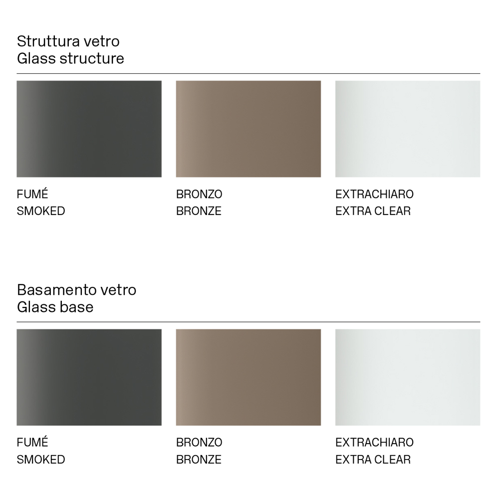 elegant og skulpturel struktur , er dette møbel født af kombinationen af materialer af forskellig natur sammen med passionen for glasbearbejdning, og formår således at definere en repræsentation af styrke og karakter gennem forskellige former og tykkelser.