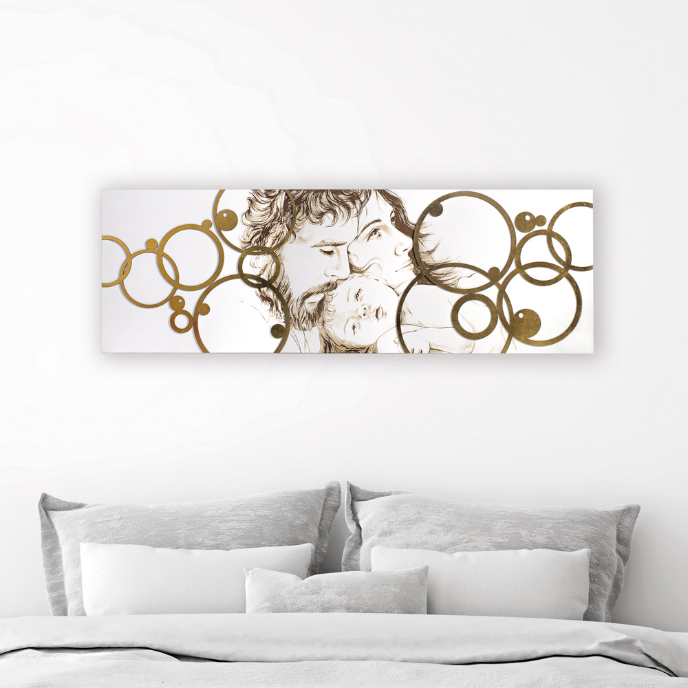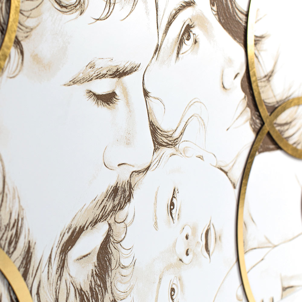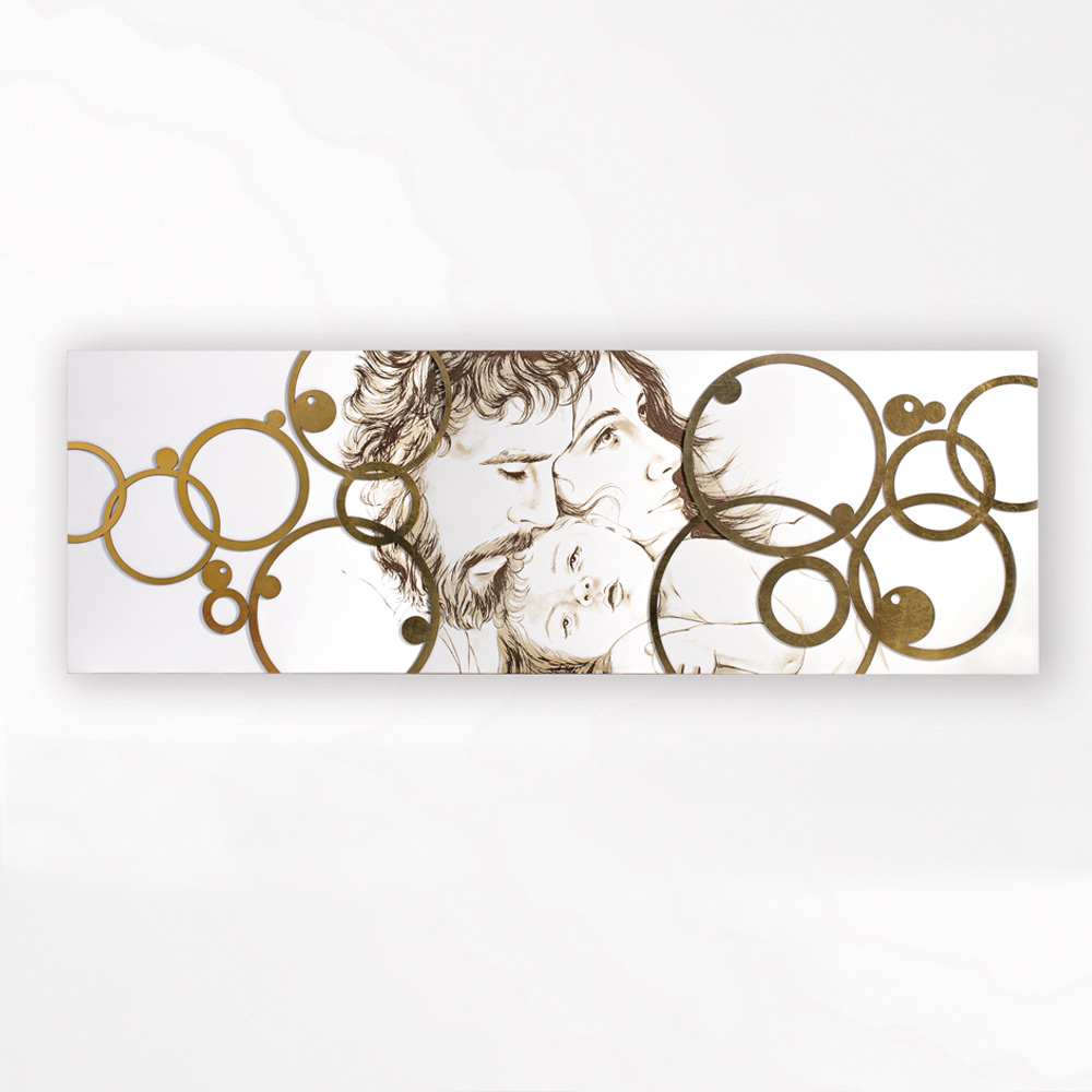 Panelet repræsenterer den hellige familie i en moderne stil . Bladgulddekorationer påføres det lasermærkede design. Mat hvidlakeret træplade med lasermarkering, en speciel teknik, der skaber et basrelief på materialerne. Applikationerne er lavet i bladguld , en speciel dyrebar teknik.