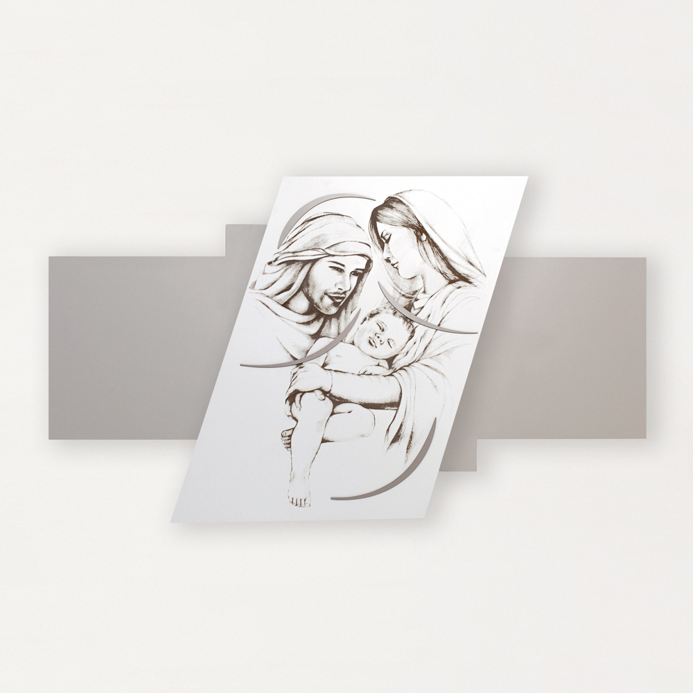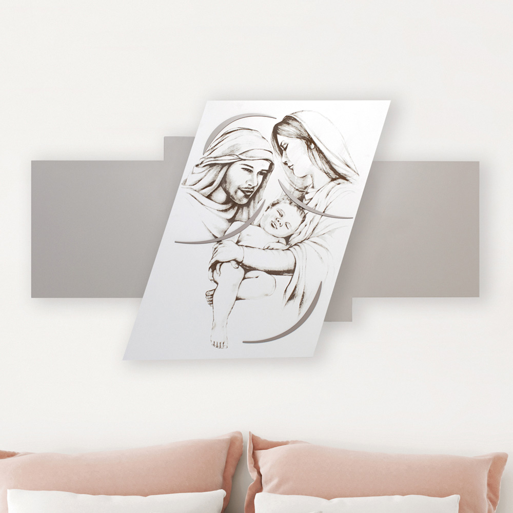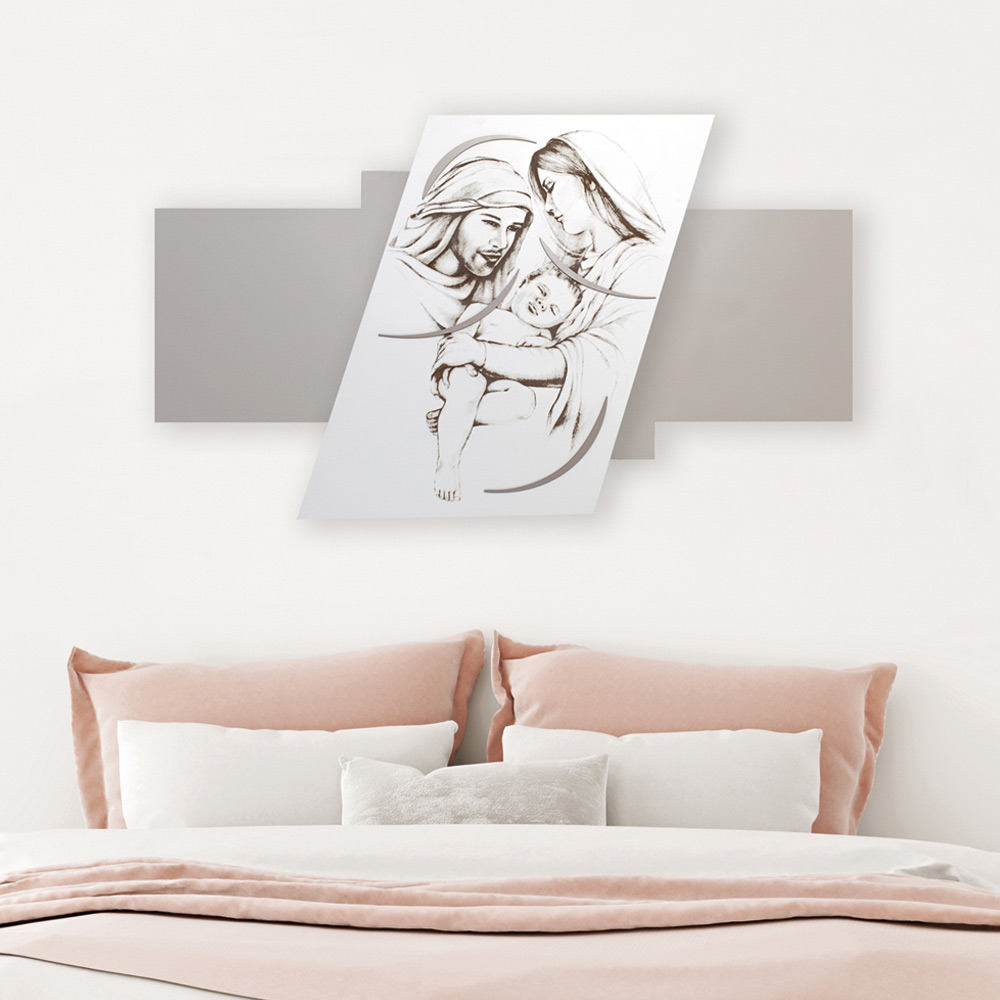 Det repræsenterer den hellige familie i lasermarkering, det er en sengegavl med et minimalt design perfekt til moderne miljøer. Lasergraveret uigennemsigtig hvidlakeret træpanel på et stenfarvet panel med grusdekorationer , der forestiller en religiøs scene.