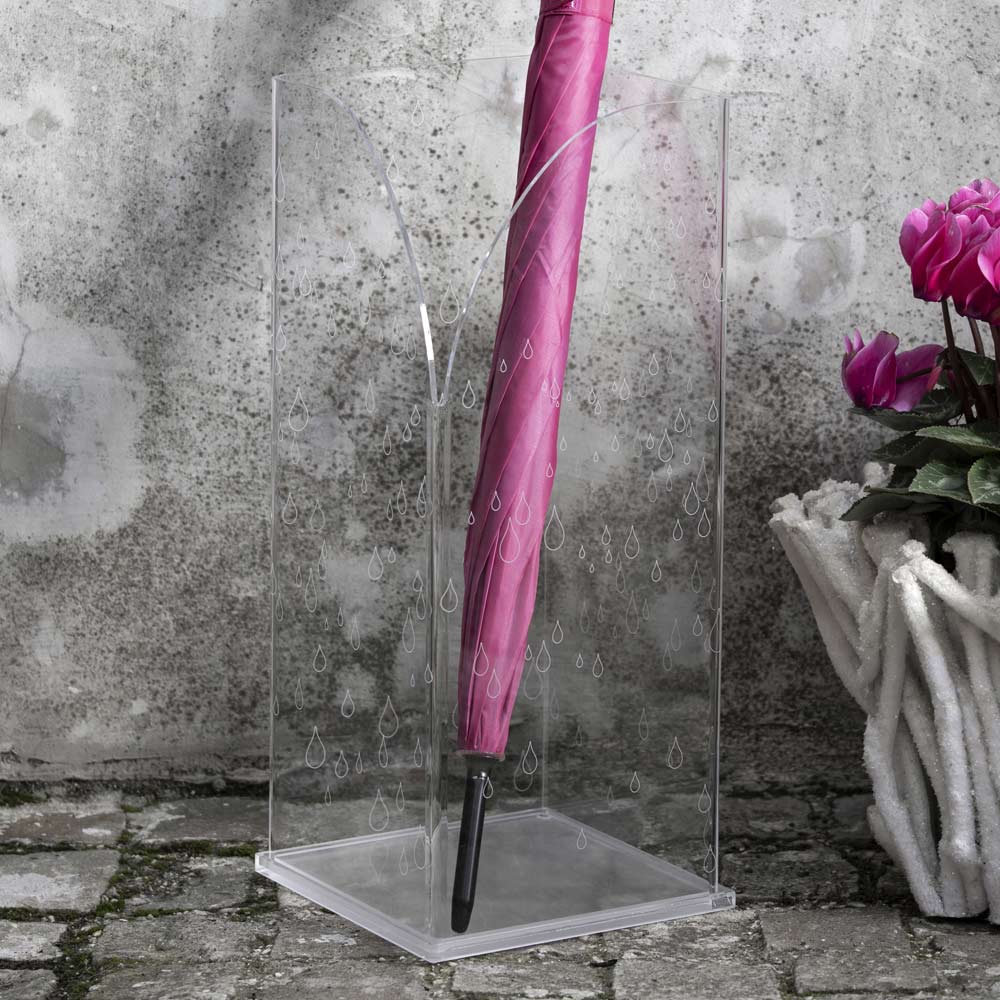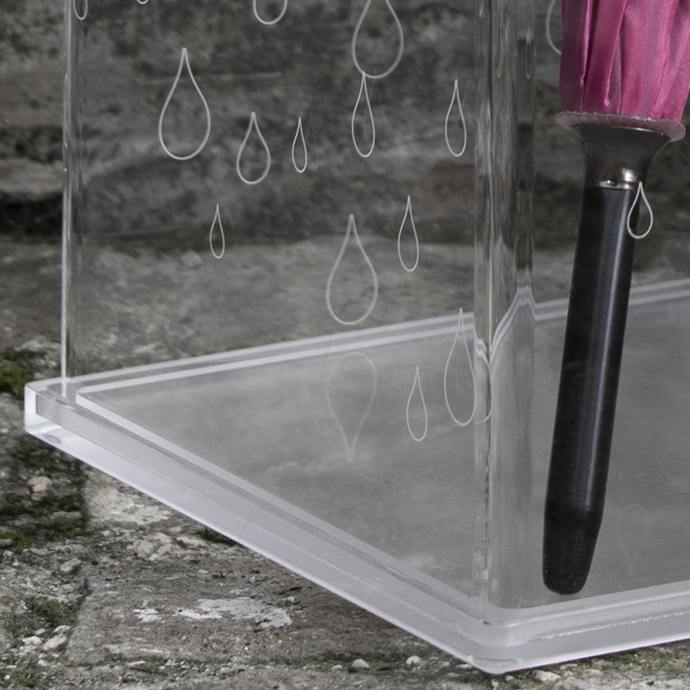 Dette rektangulære paraplystativ har en struktur, der udelukkende er lavet af gennemsigtigt akrylkrystalskåret og lasergraveret med dekorationer, der forestiller vanddråber, i en tykkelse på 3 mm og 10 mm for bunden.