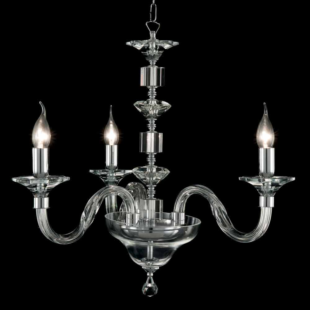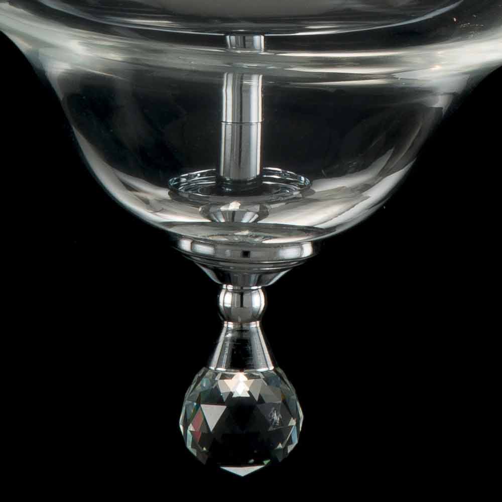 Håndlavet transparent glas lysekrone med krystal dekorationer. Forkromet finish.