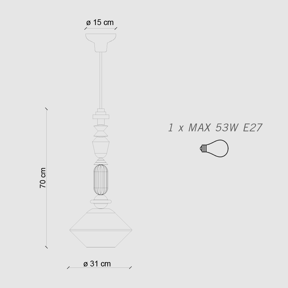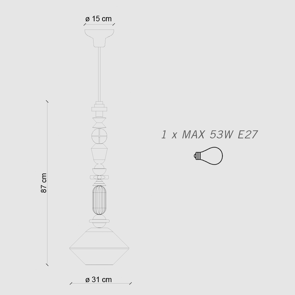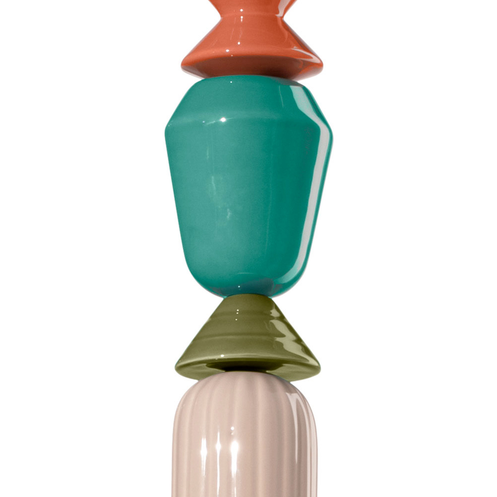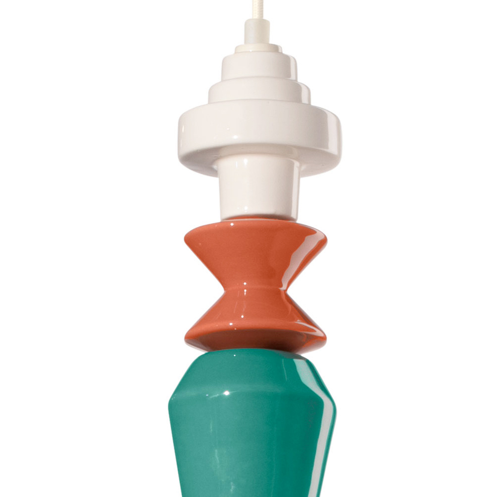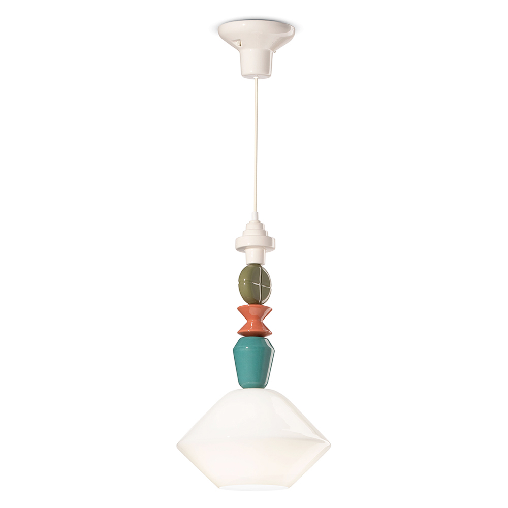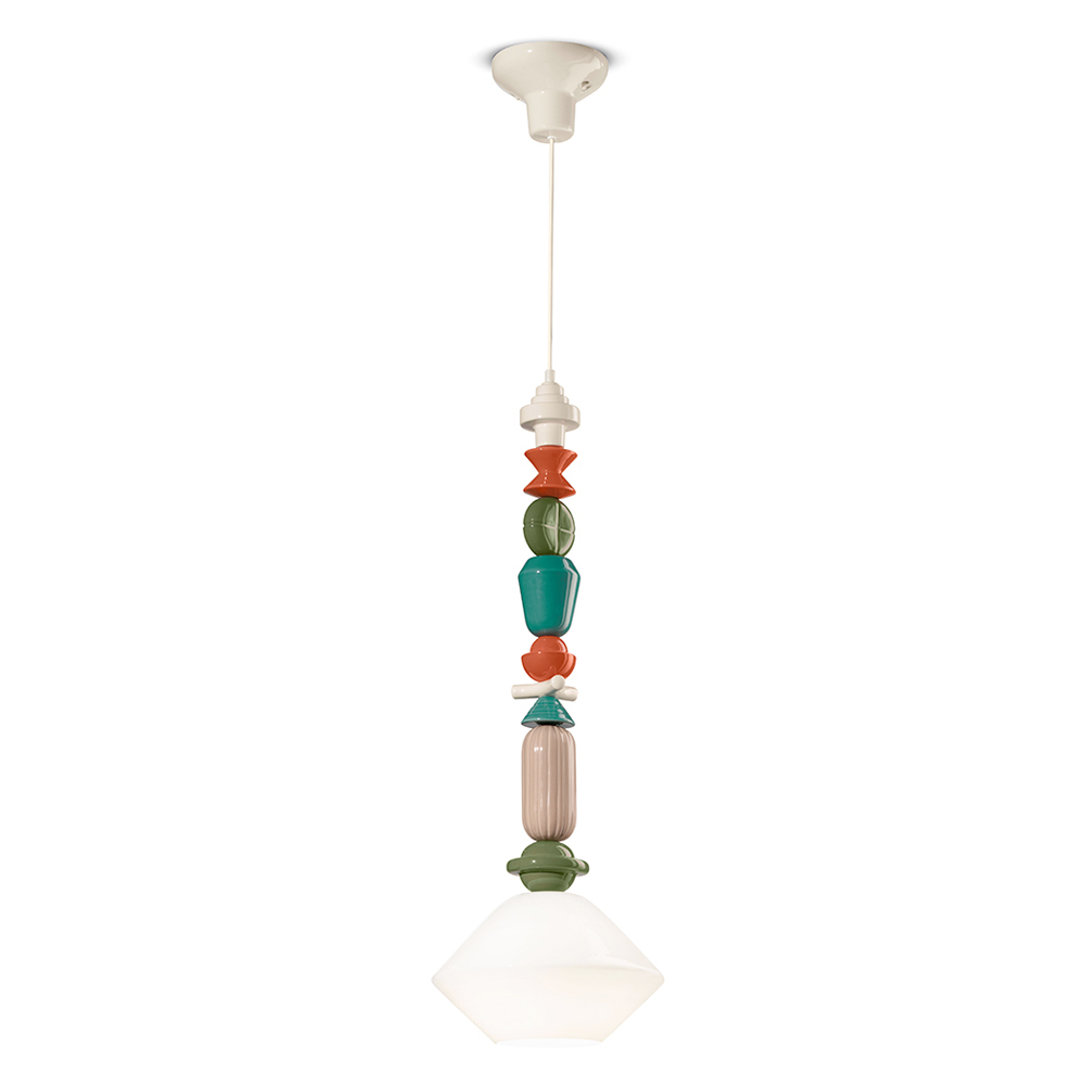 Denne pendel er et lysende kunstværk , der kombinerer varmen fra keramik med glasets gennemsigtighed. Med sine geometriske former og rækkefølge af farvede elementer er dette møbel som et totem af lys og farver, der tilføjer personlighed og livlighed til ethvert rum.