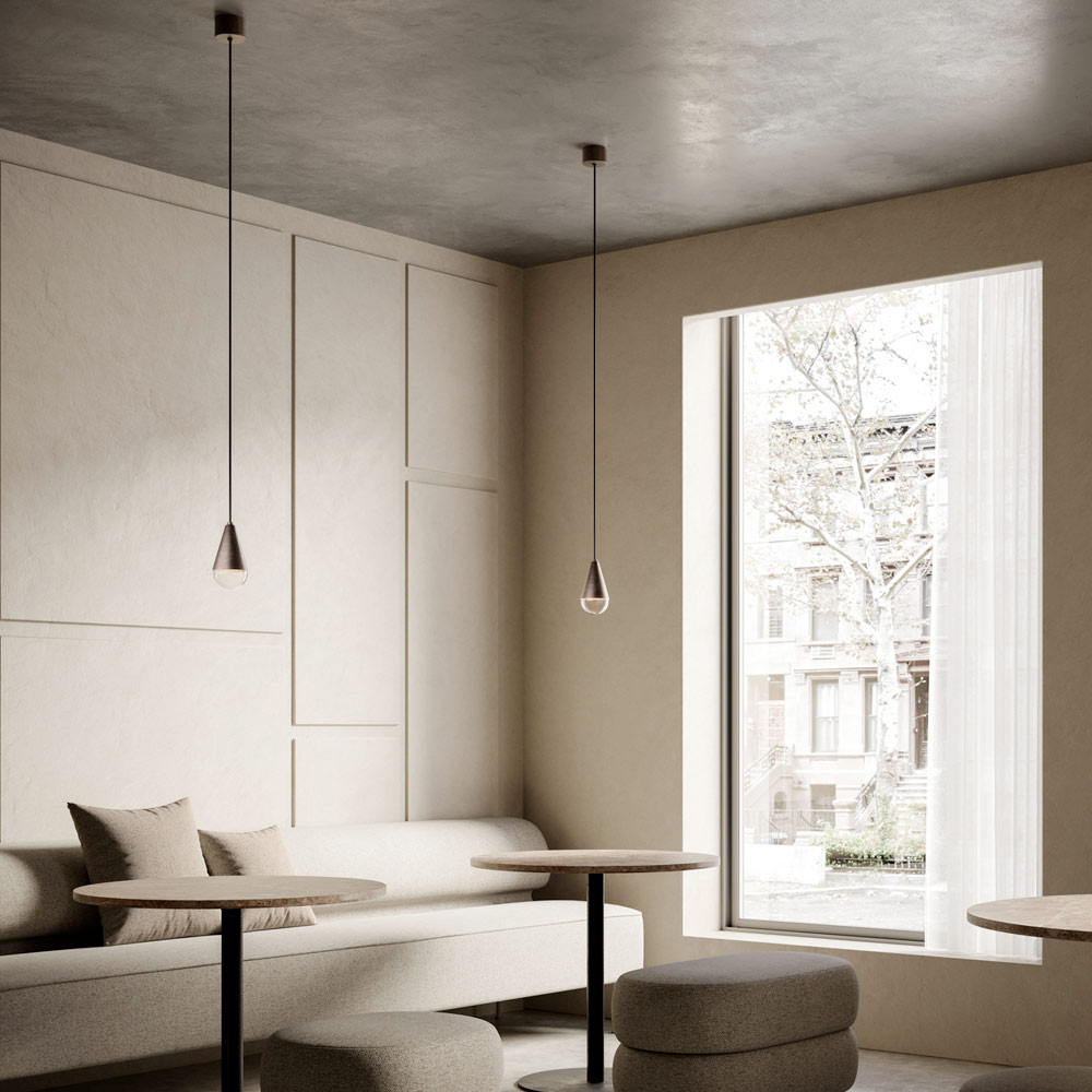 Made in Italy. De rene linjer i samlingen af indendørs lamper fremhæver renheden af jernmaterialet. Vedhængselementet kan bruges alene eller i kombination med andre, til at skabe lineære kompositioner eller grupperinger med en scenografisk effekt.