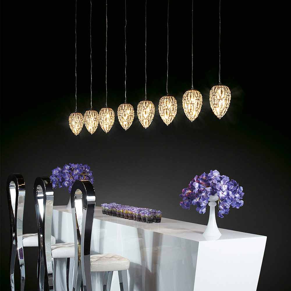 Særegenheder denne lampe, hvilket understreger dens entydighed, er tilstedeværelsen af krystaller Asfour facetteret manuelt fastgjort til selve strukturen.