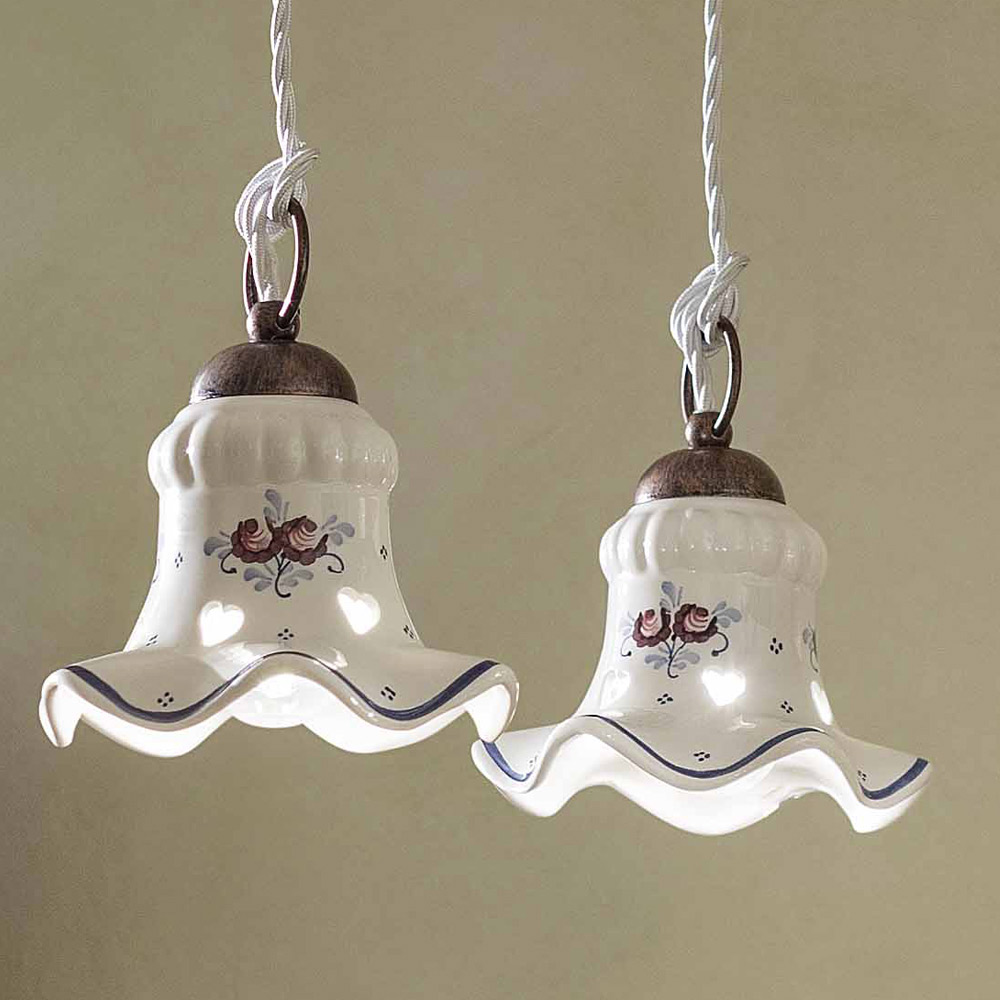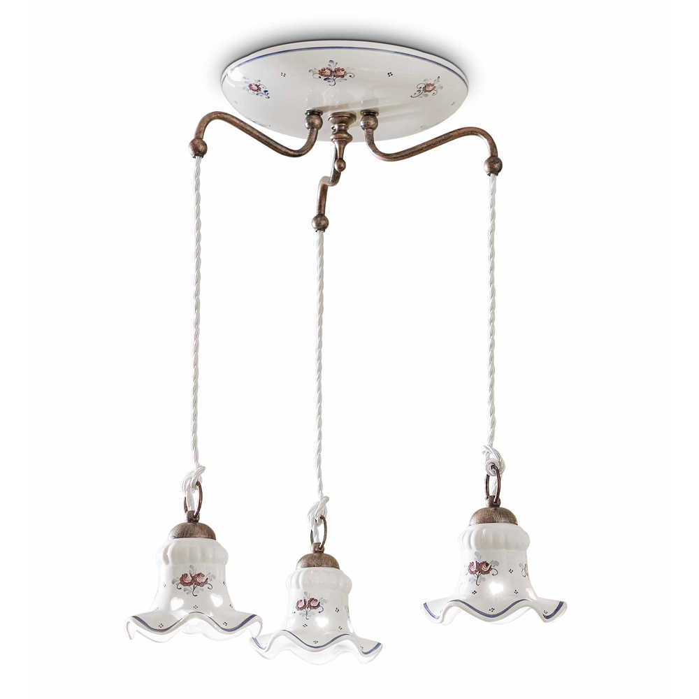 Rund pendel 3 lys i jern og hånddekoreret keramik, lavet i Italien af Ferroluce.