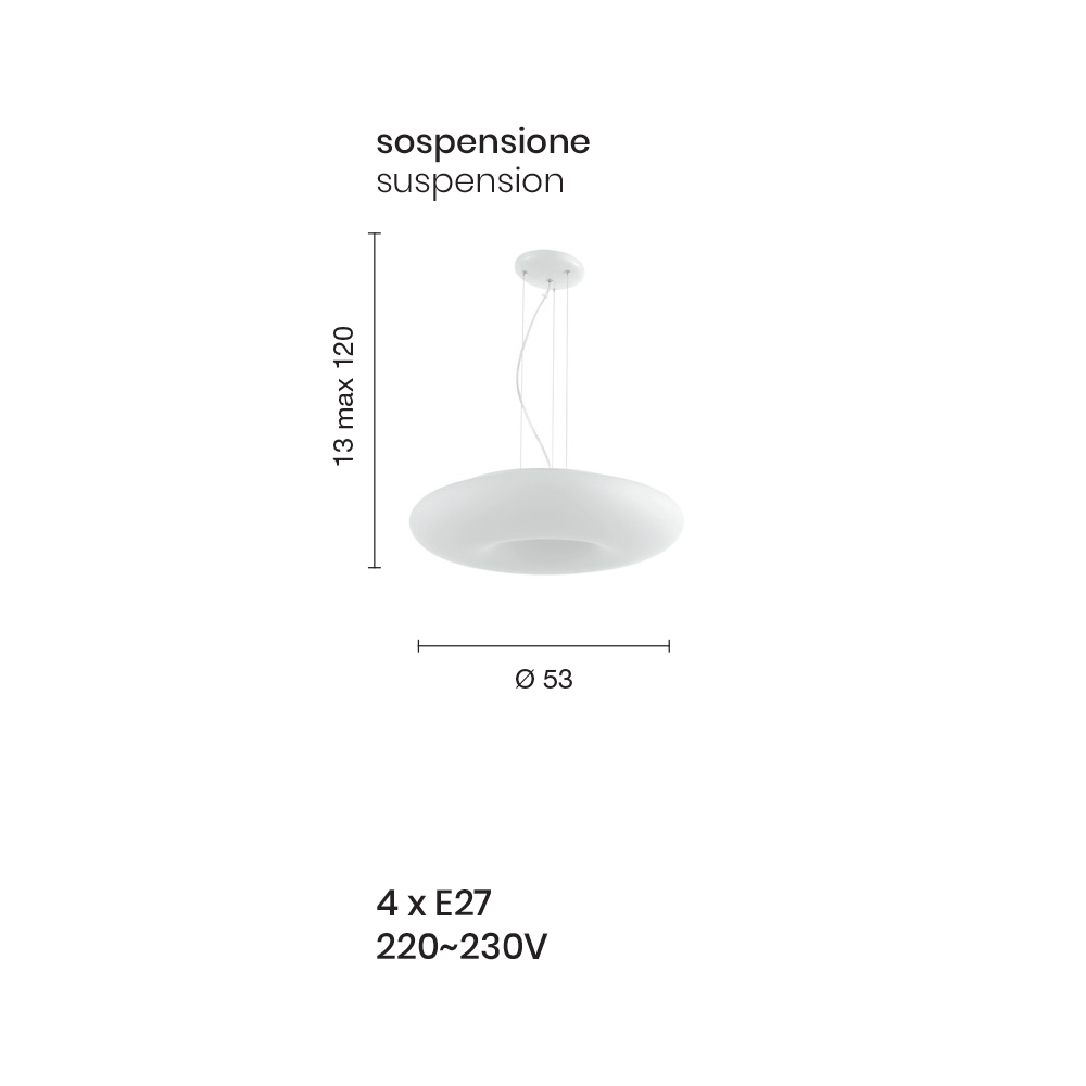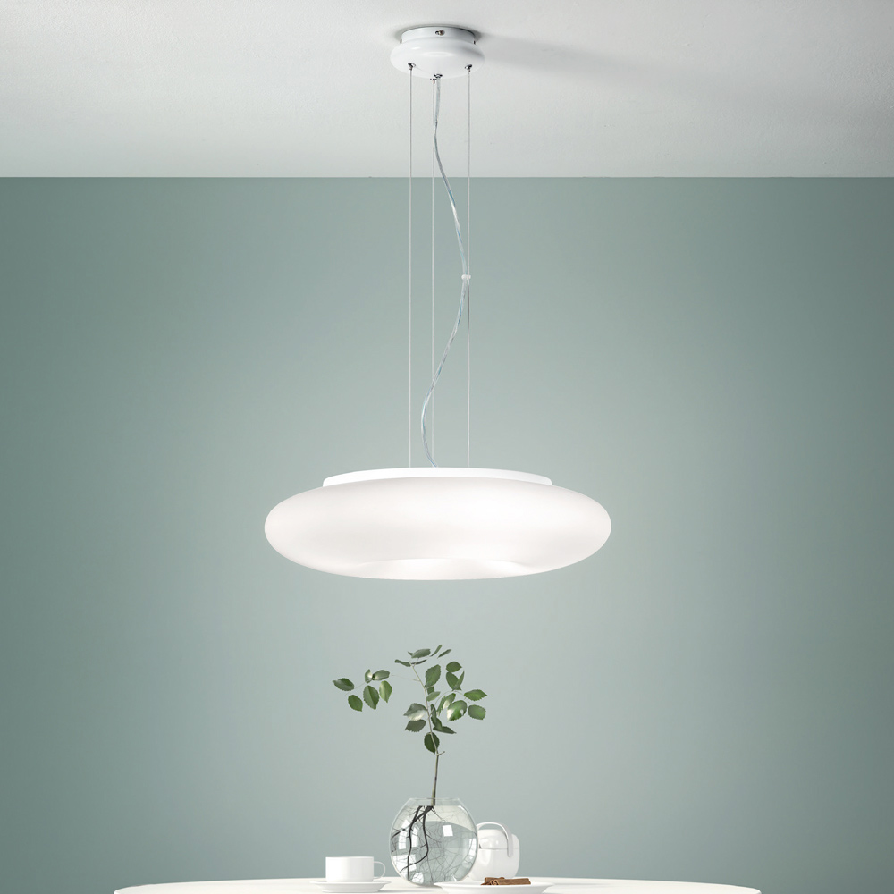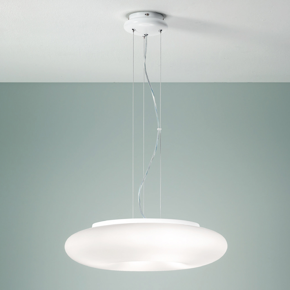 Pendellampe med struktur lavet af forkromet metal og hvidblæst ætset glas diffusor komplet med kabler, der kan justeres i længden. Bløde former og slyngede linjer giver liv til en kvalitetsmøbelløsning, der er i stand til at berige boligrum som spisestuer, stuer eller soveværelser gennem en stærk moderne personlighed og en sober og elegant karakter . Dens raffinerede æstetik er understreget og gjort unik ved valget af at bruge blæst glas, et sofistikeret materiale, der øger den eksklusive side af produktet og giver mulighed for særlig funktionel belysning .