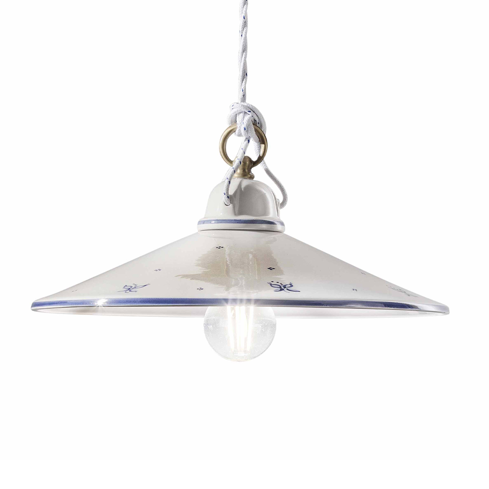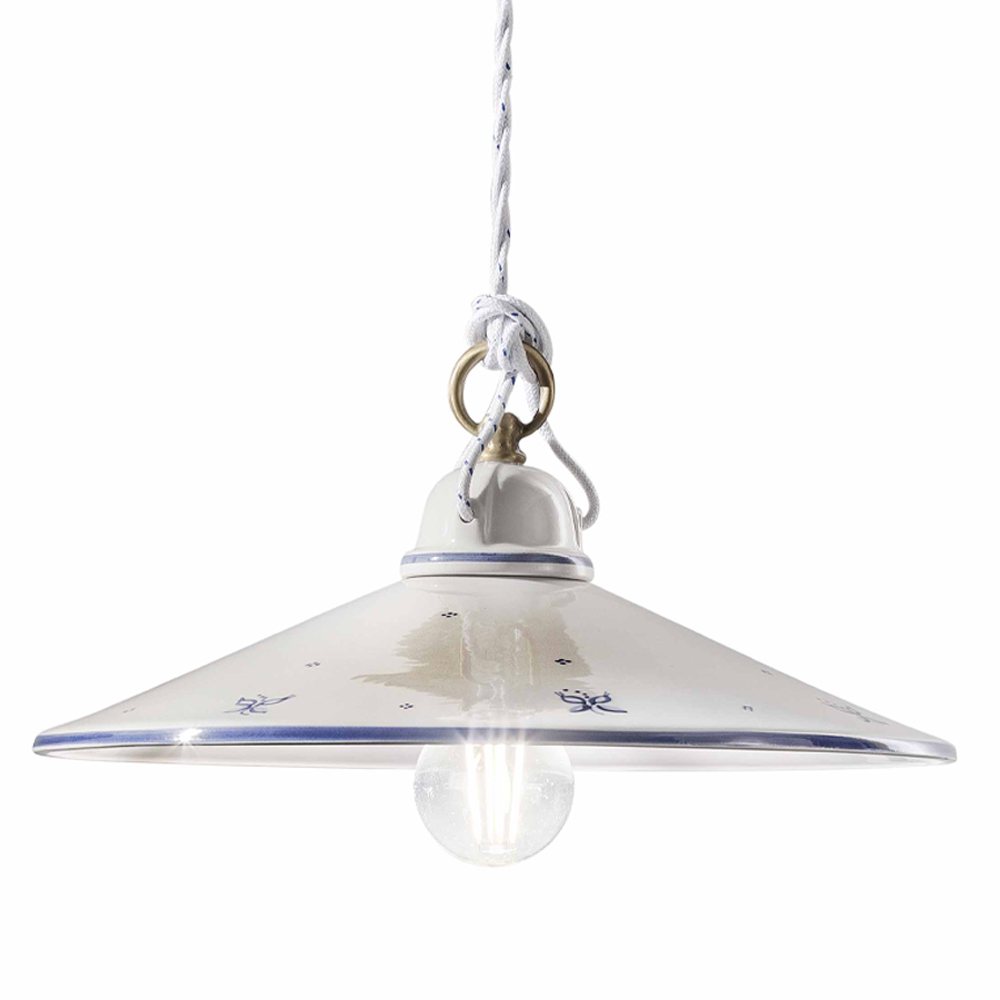 Vintage hængelampe i jern og håndmalet keramik lavet i Italien af Ferroluce.