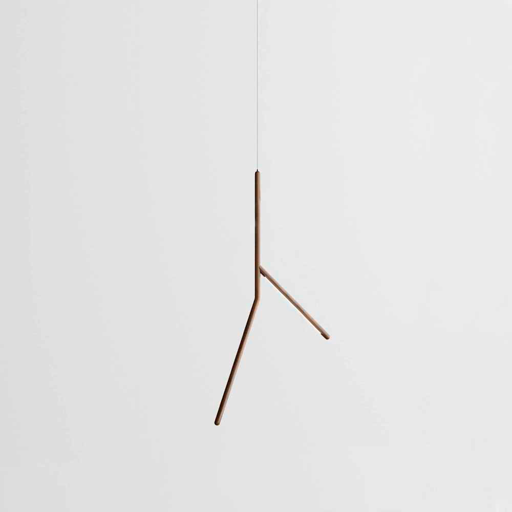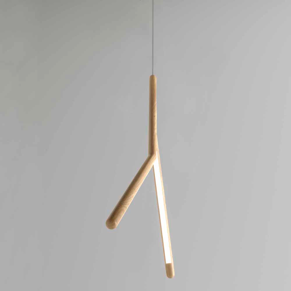Denne lampe kombinerer håndværket af massivt træ med lysteknologi. Det sarte grafiske skilt fremhæves i installationer med flere lamper og bliver miljøets absolutte hovedperson.