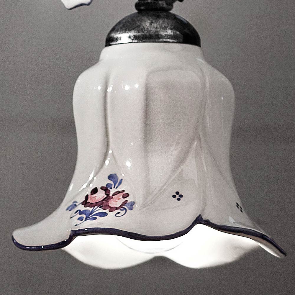 Pendellampe i metal og keramik med håndmalede roser lavet i Italien af Ferroluce.