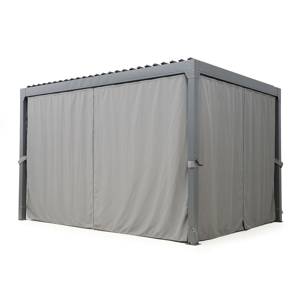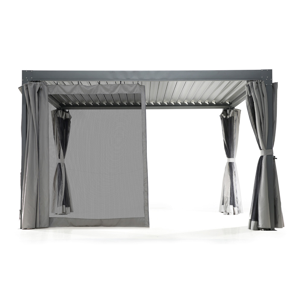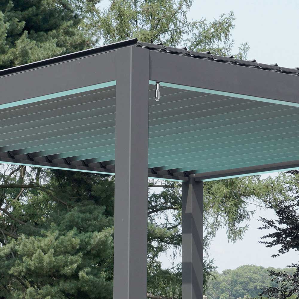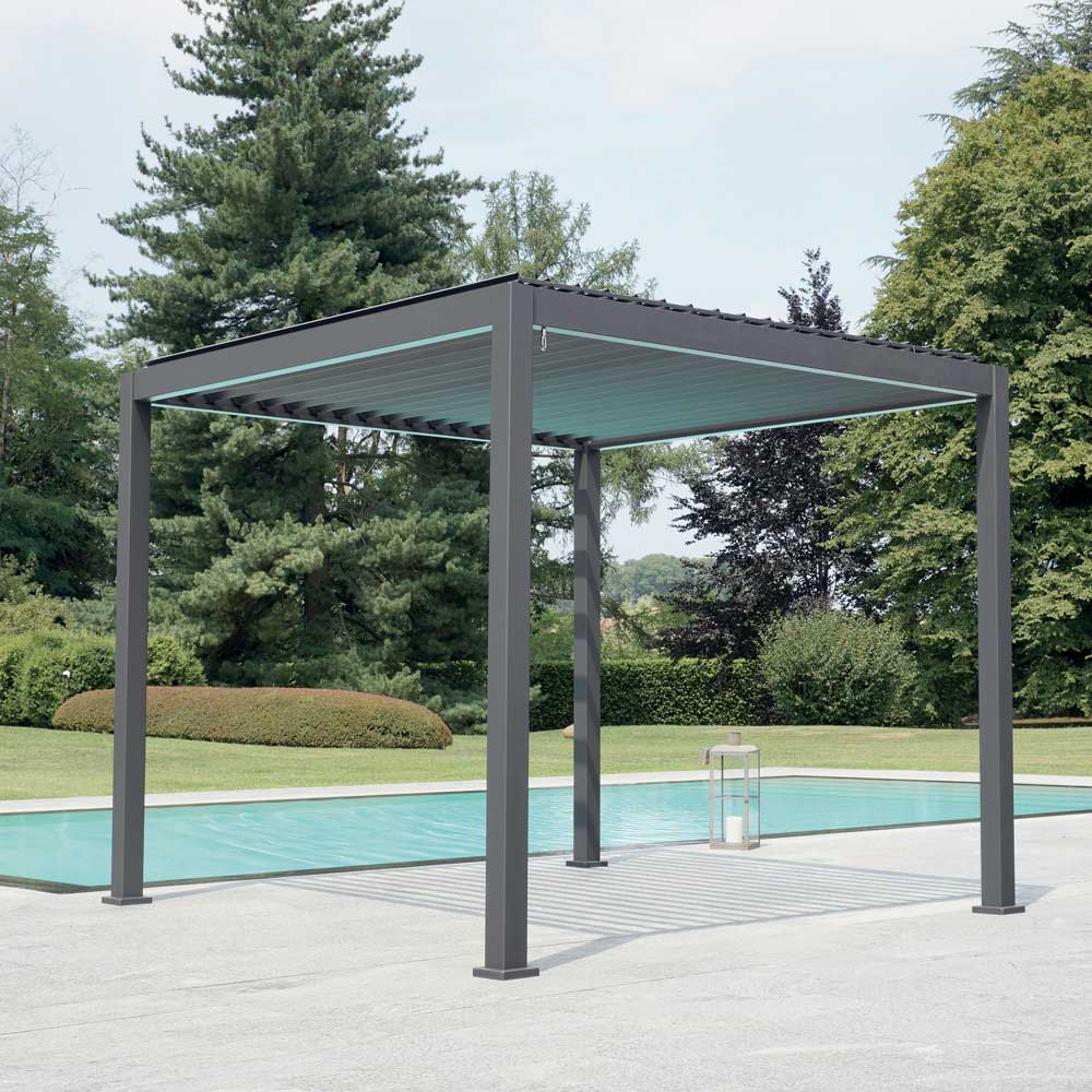 Denne havepergola repræsenterer den perfekte balance mellem moderne design og avanceret funktionalitet . Dens malede aluminiumsstruktur , solid og modstandsdygtig over for elementerne, giver et strejf af minimal elegance , der integreres perfekt i prestigefyldte udendørs miljøer, såsom private haver , terrasser eller poolkanter .