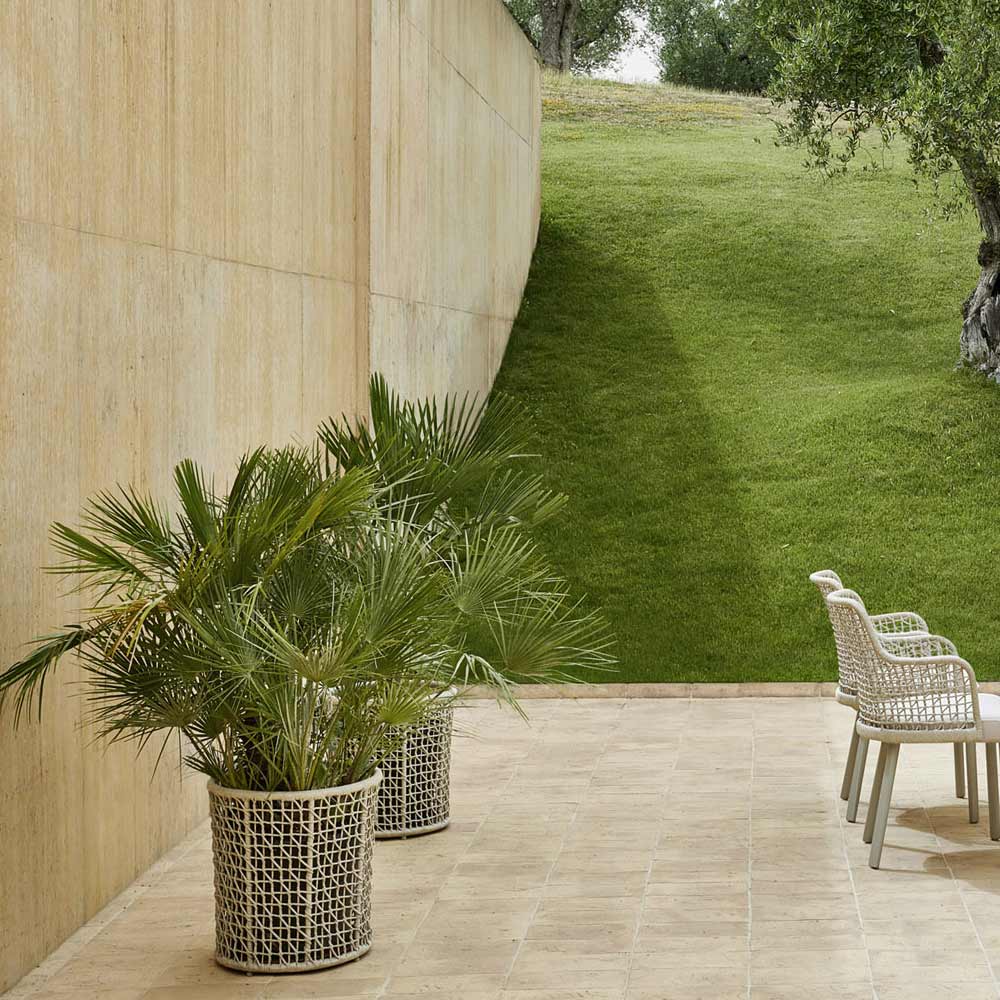 Udendørs plantekasse med underkop bestående af en pulverlakeret aluminiumsstruktur og håndvævet beige reb . Karakteriseret af et essentielt design , er dette produkt udtænkt og designet til at repræsentere en praktisk løsning og samtidig berige ethvert udendørsrum med et strejf af moderne og raffineret personlighed .