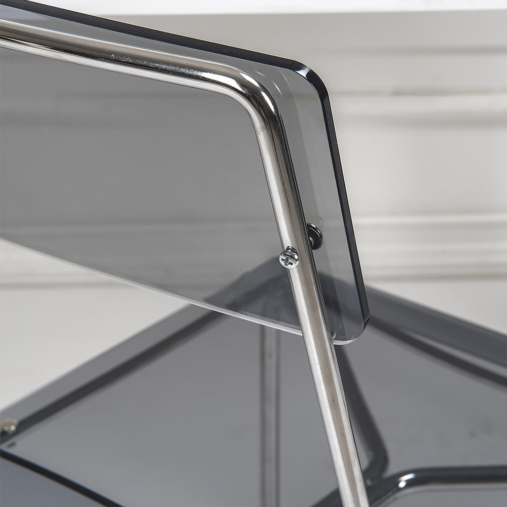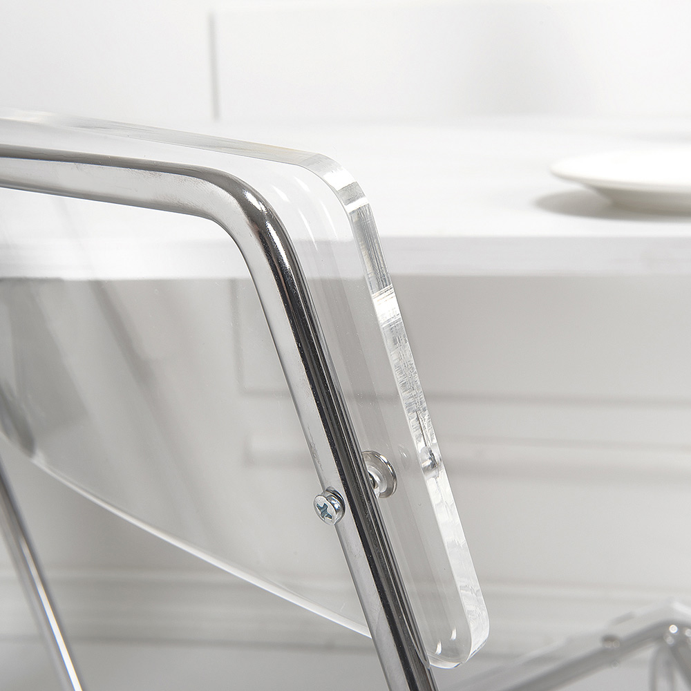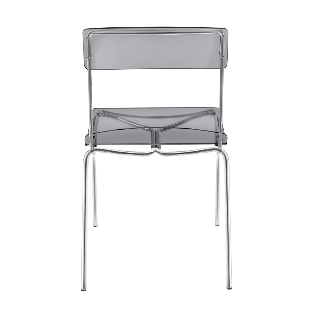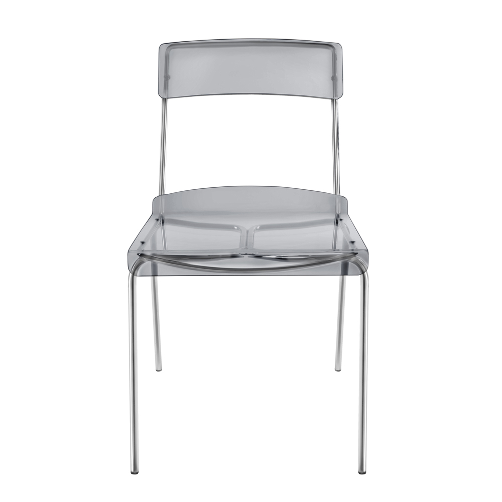 Spisestuestol med skal af plexiglas og sølvforkromet metalstruktur , helt fremstillet i Italien . En ideel indretningsløsning til dem, der søger enkelhed og alsidig brug for at kunne indrette deres boligrum med en moderne karakter og høj funktionalitet . Formen på strukturen gør det også muligt at stable dem, hvilket gør det til en perfekt idé også til kontraktrum som barer og restauranter.