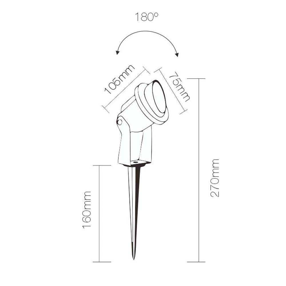 Udendørs spotlight med sort støbt aluminiumsstruktur komplet med 3W LED med 180° justerbar krop. En LED-spot til udendørs brug med en spids, der skal nedfældes i jorden med et moderne og alsidigt design, der projicerer en anderledes lysstråle efter behov takket være muligheden for at orientere den efter dine behov. Ideel til belysning af planter, træer, blomsterbede inde i udendørs rum såsom haver både i boligrum og i kontraktmiljøer.