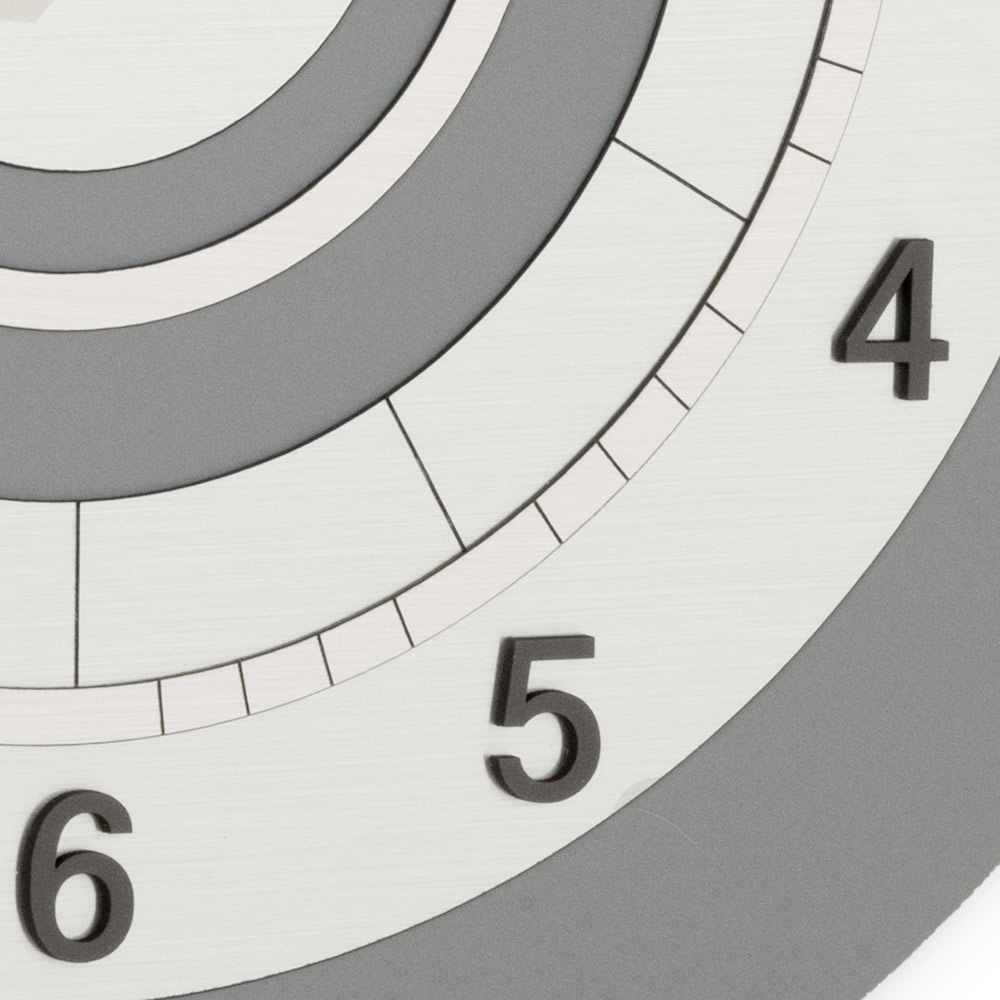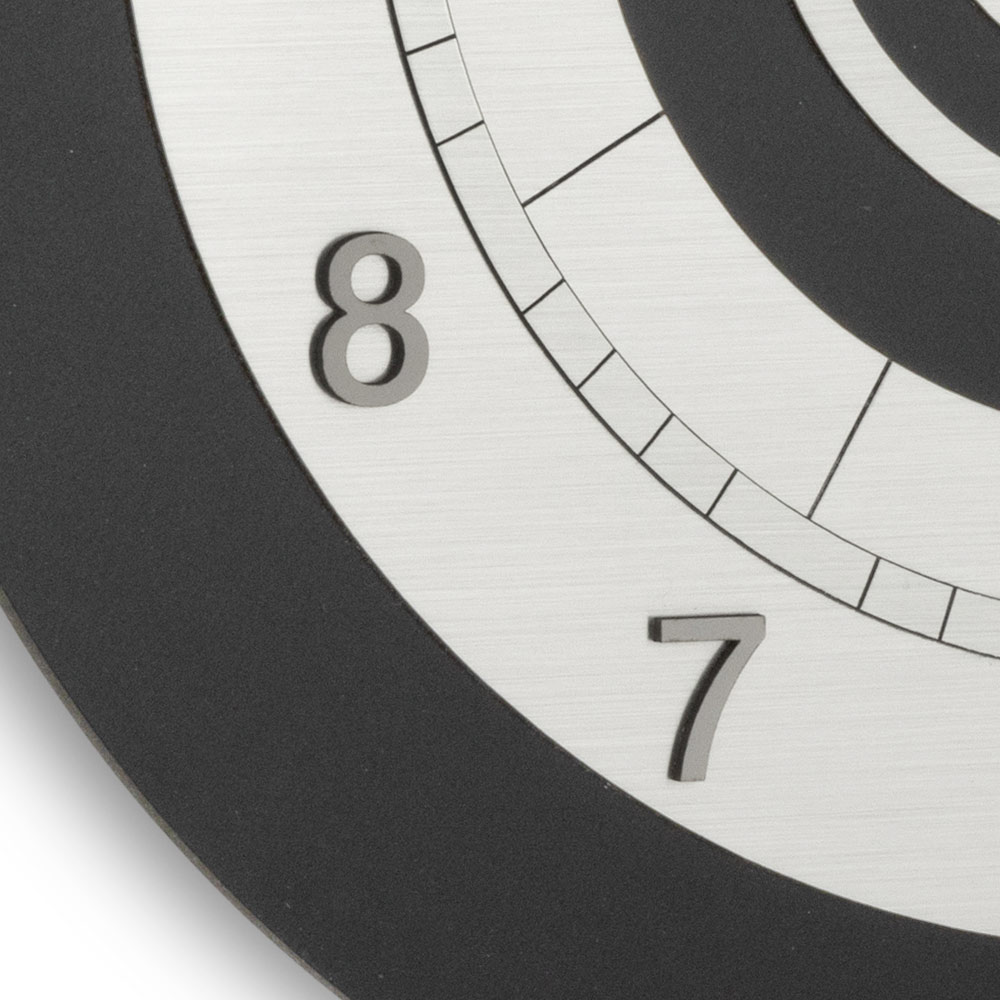 Den ramme omfavner en urskive med prægede, elegante og letlæselige tal. De subtile visere og kontrastfarverne skaber en balance mellem modernitet og raffinement, perfekt til moderne omgivelser, både i hjemmet og i erhvervslivet.