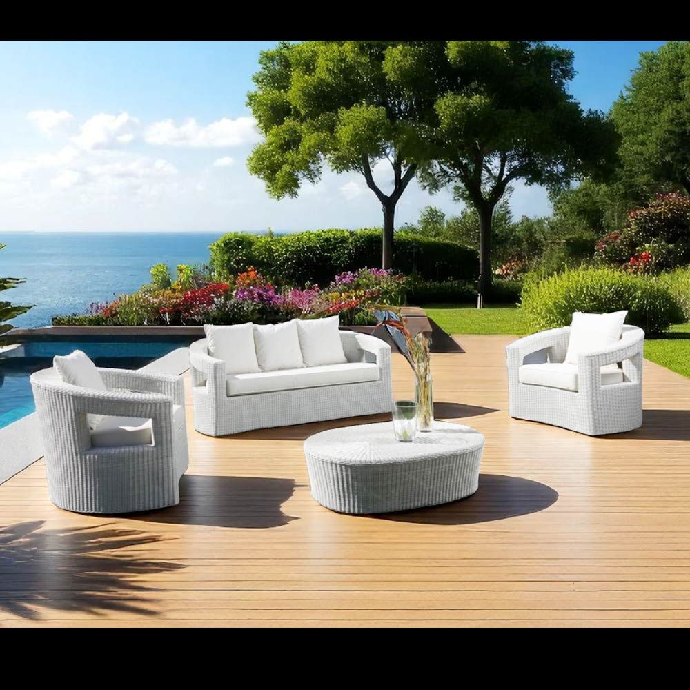Dette havemøbelsæt med sin underspillede og moderne elegance er perfekt til at berige ethvert udendørsområde med stil. De rene linjer og indbydende former på sofaerne og lænestolene skaber en indbydende atmosfære, ideel til afslapning eller socialt samvær i det fri. Sættet indeholder en komfortabel to-personers sofa og to enkeltstående lænestole , der hver især suppleres af bløde hynder i vejrbestandigt stof, som lover langvarig komfort og minimal vedligeholdelse.