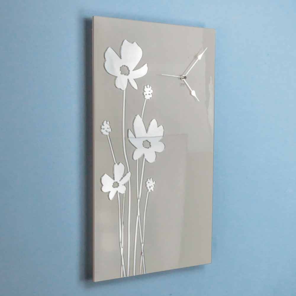 Rektangulært vægur i moderne design i hvidt træ med indlagte spejle i plexiglas, fremstillet i Italien.