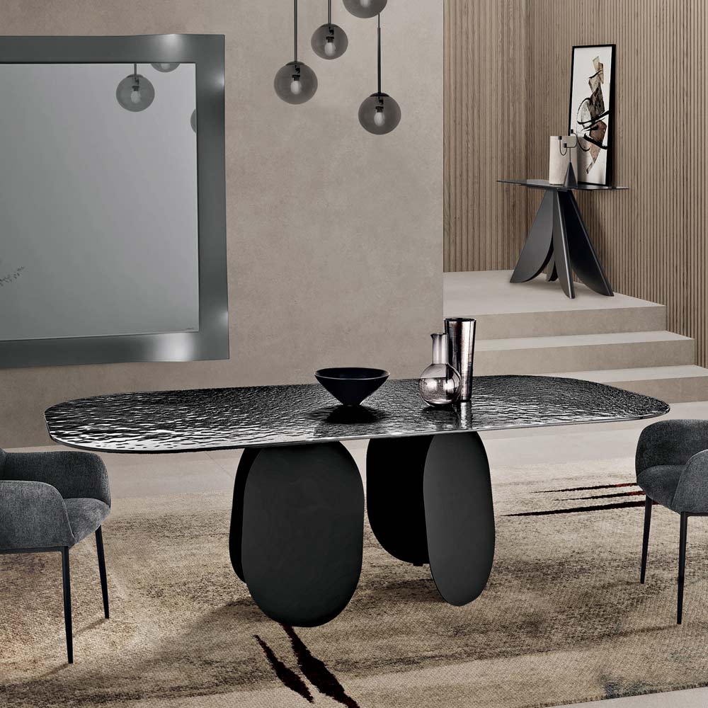 Et raffineret, italienskproduceret designer-spisebord , ideelt til elegant indretning af spisestuen eller opholdsstuen . Denne rektangulære version bevarer kollektionens skulpturelle essens og skaber et dristigt, men harmonisk udtryk i ethvert rum.