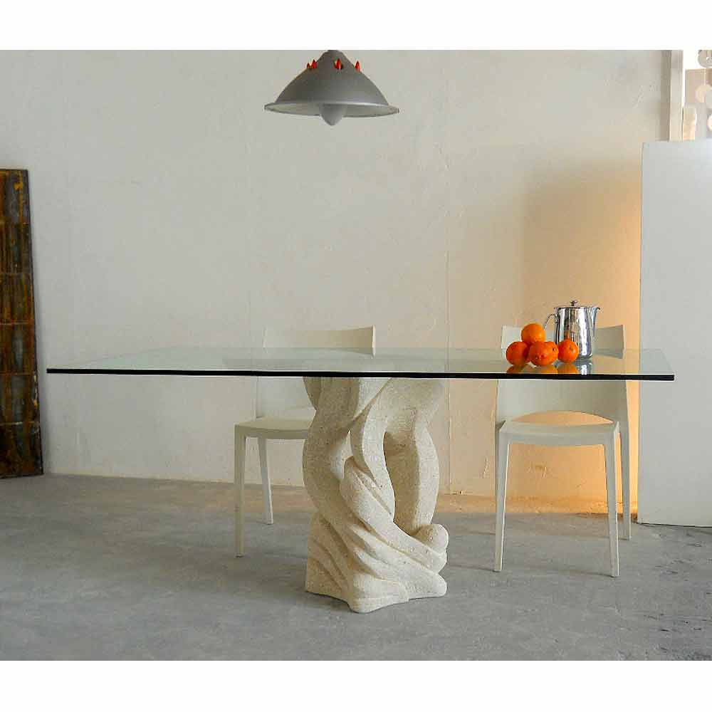 Moderne rektangulært spisebord Fremstillet i Italien med central base i naturlig Vicenza sten , håndskåret af den massive blok og med 15 mm tykt floatglasplade, understøttet af en børstet og lakeret råmetalbjælke.