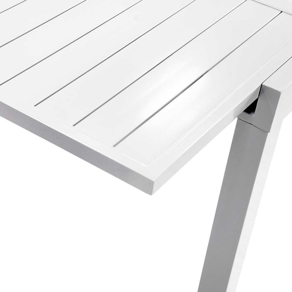 Dette udtrækkelige aluminiumsbord har et rent og moderne design, der er ideelt til dem, der leder efter en alsidig og holdbar løsning til udendørsarealer. Bordet har ikke kun en robust overflade, der er nem at rengøre, men også en æstetik, der passer perfekt til enhver form for udendørsmøbler.