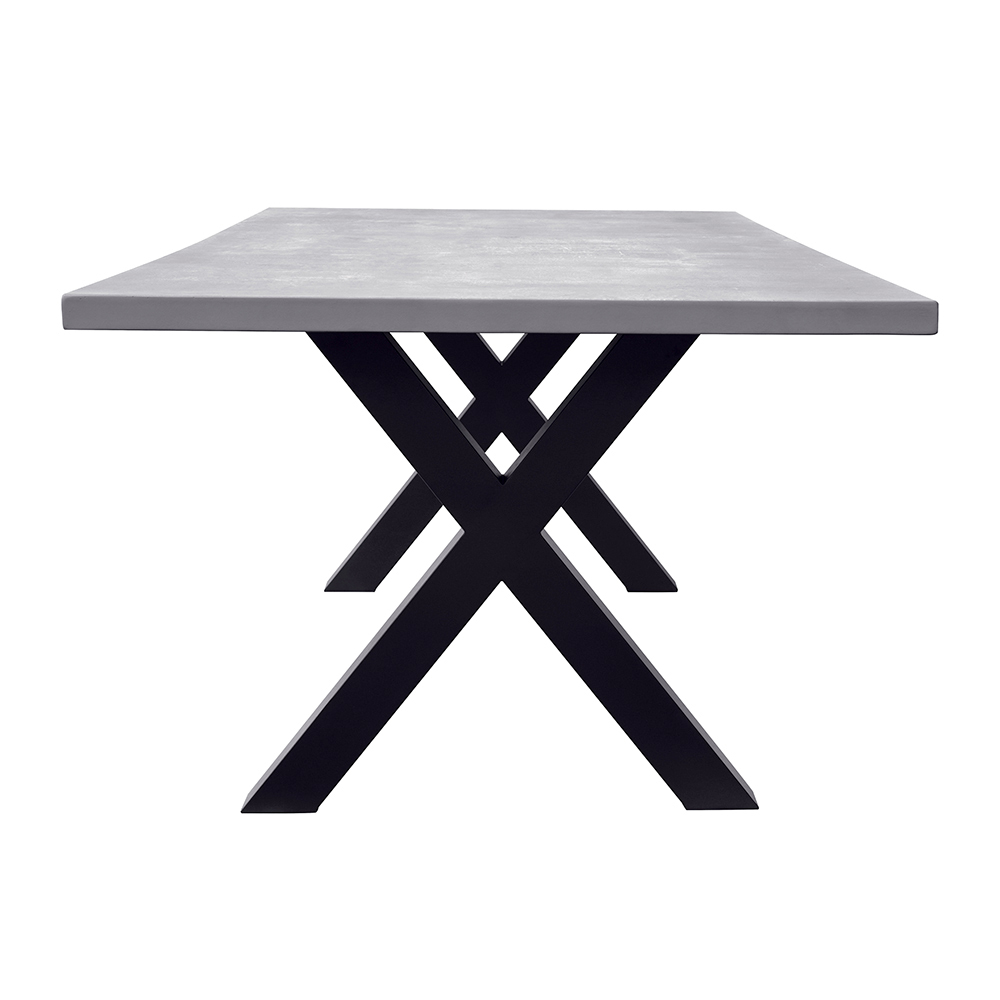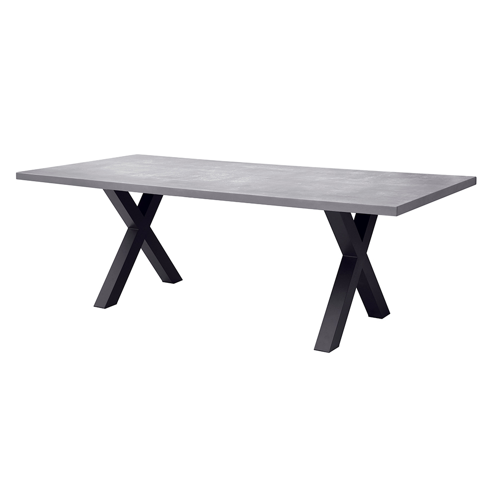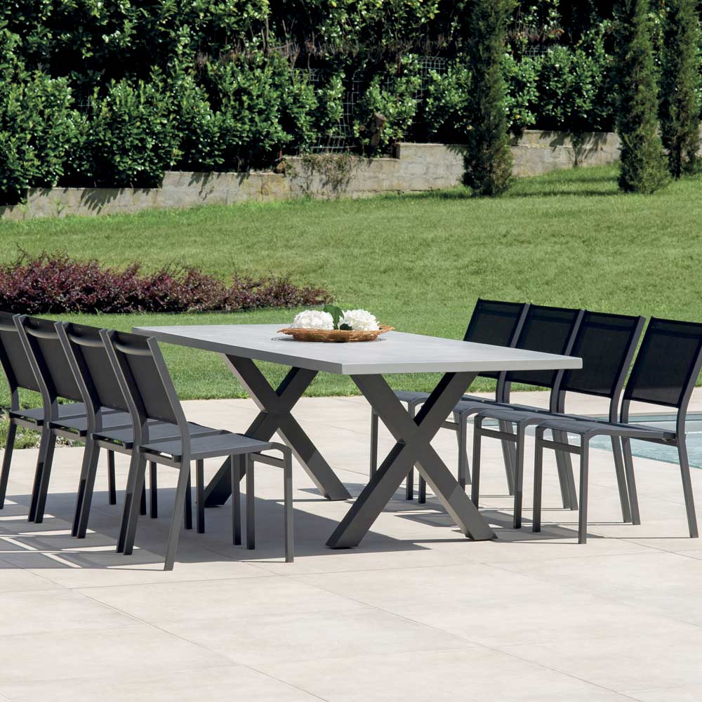 Den grå harpikstop kombinerer elegance og praktisk anvendelighed, hvilket sikrer en holdbar og rengøringsvenlig overflade, der er egnet til alle vejrforhold. De krydsede aluminiumsben giver strukturen et dynamisk og moderne udseende, samtidig med at den sikrer stabilitet og robusthed.