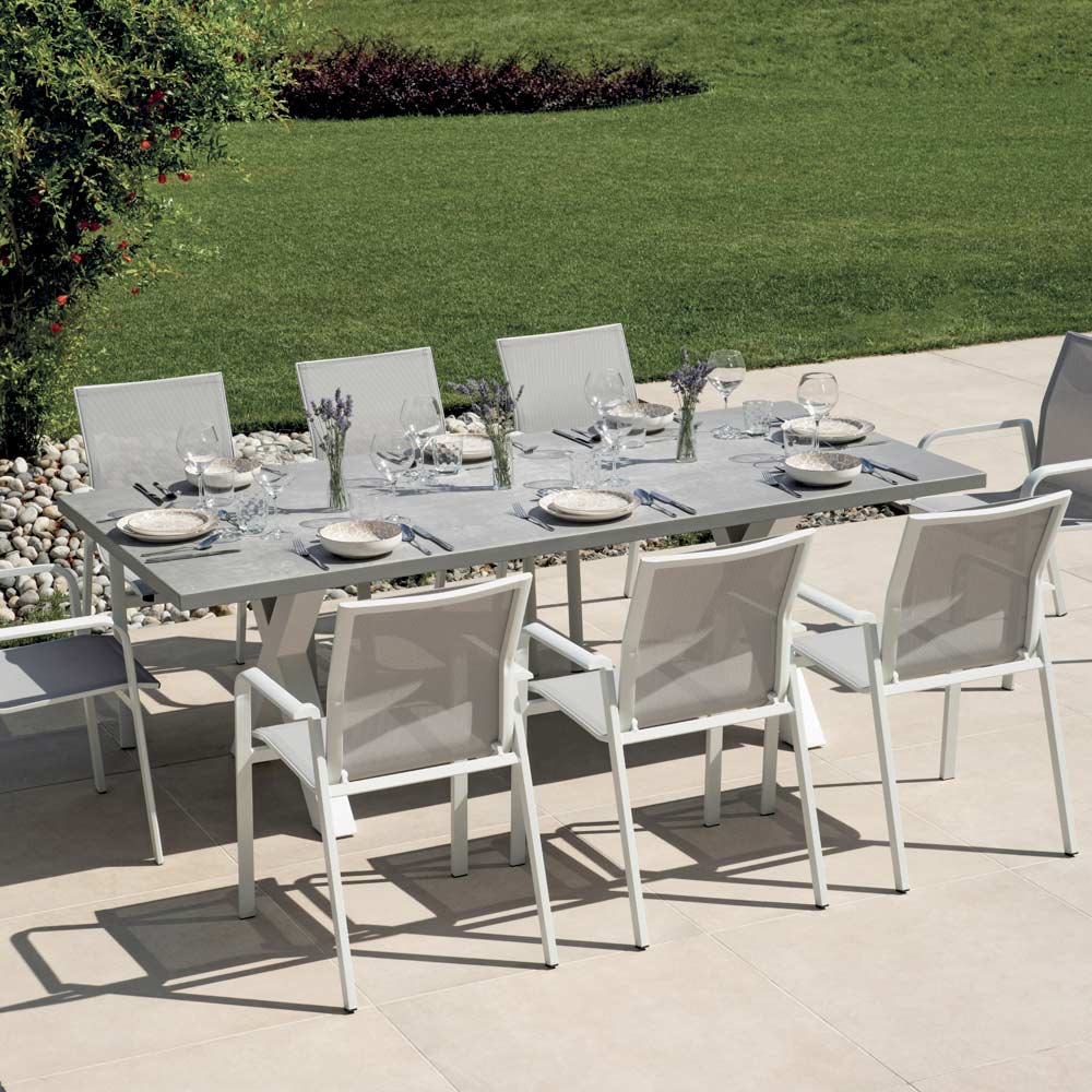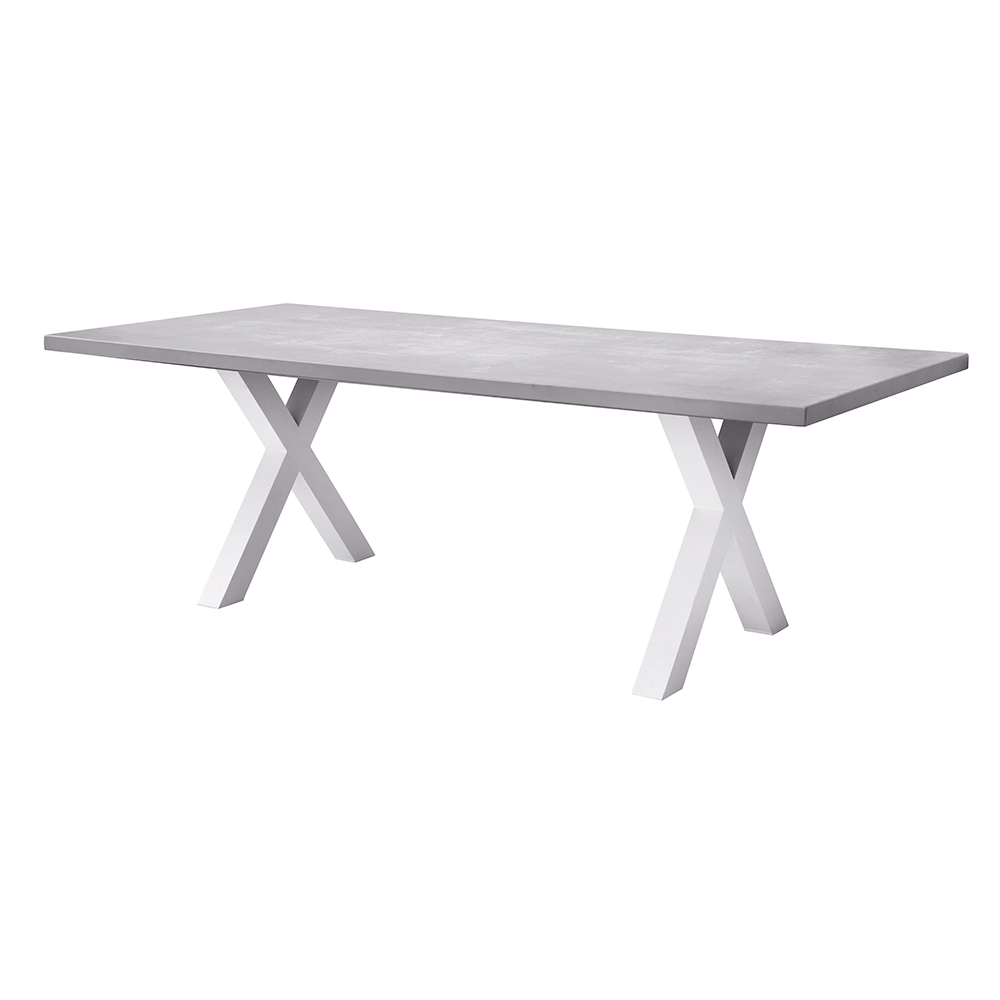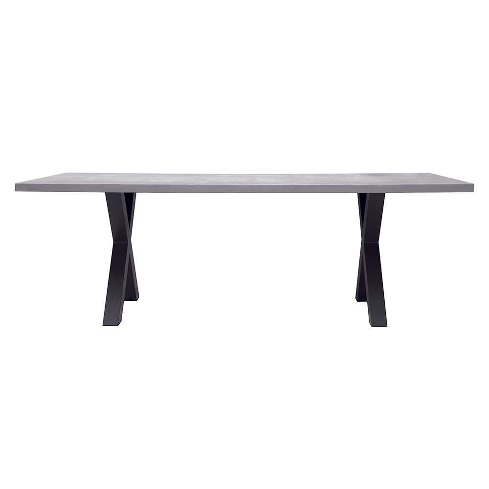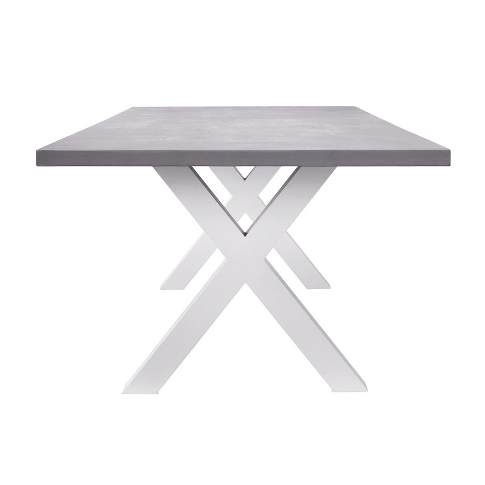 Den grå harpikstop kombinerer elegance og praktisk anvendelighed, hvilket sikrer en holdbar og rengøringsvenlig overflade, der er egnet til alle vejrforhold. De krydsede aluminiumsben giver strukturen et dynamisk og moderne udseende, samtidig med at den sikrer stabilitet og robusthed.