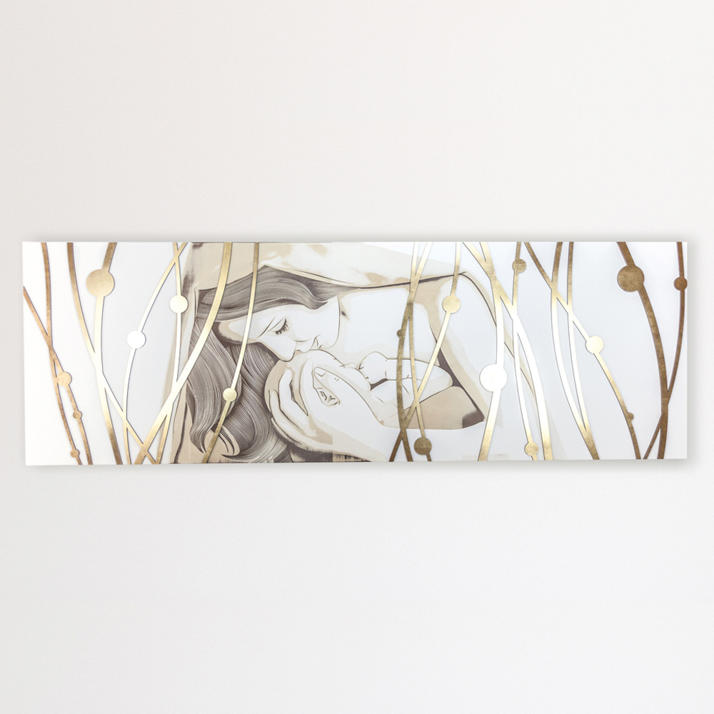Det dekorative panel er lavet ved hjælp af lasermarkeringsteknikken. Det sidste kan ses i moderens og barnets træk og i det tykke hår, der indrammer de to ansigter.