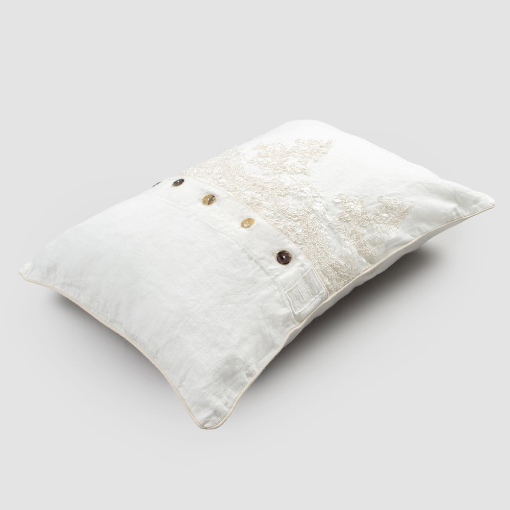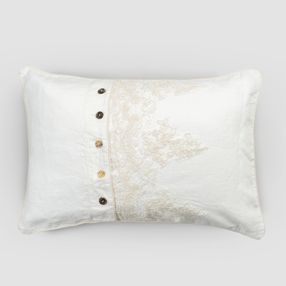 Traditionens værdi slutter sig til den moderne livsstil med denne naturlige hvide pudebetræk af linned pyntet med en central række Agoya-knapper i perlemor og elegant blonder , rørprofil .
